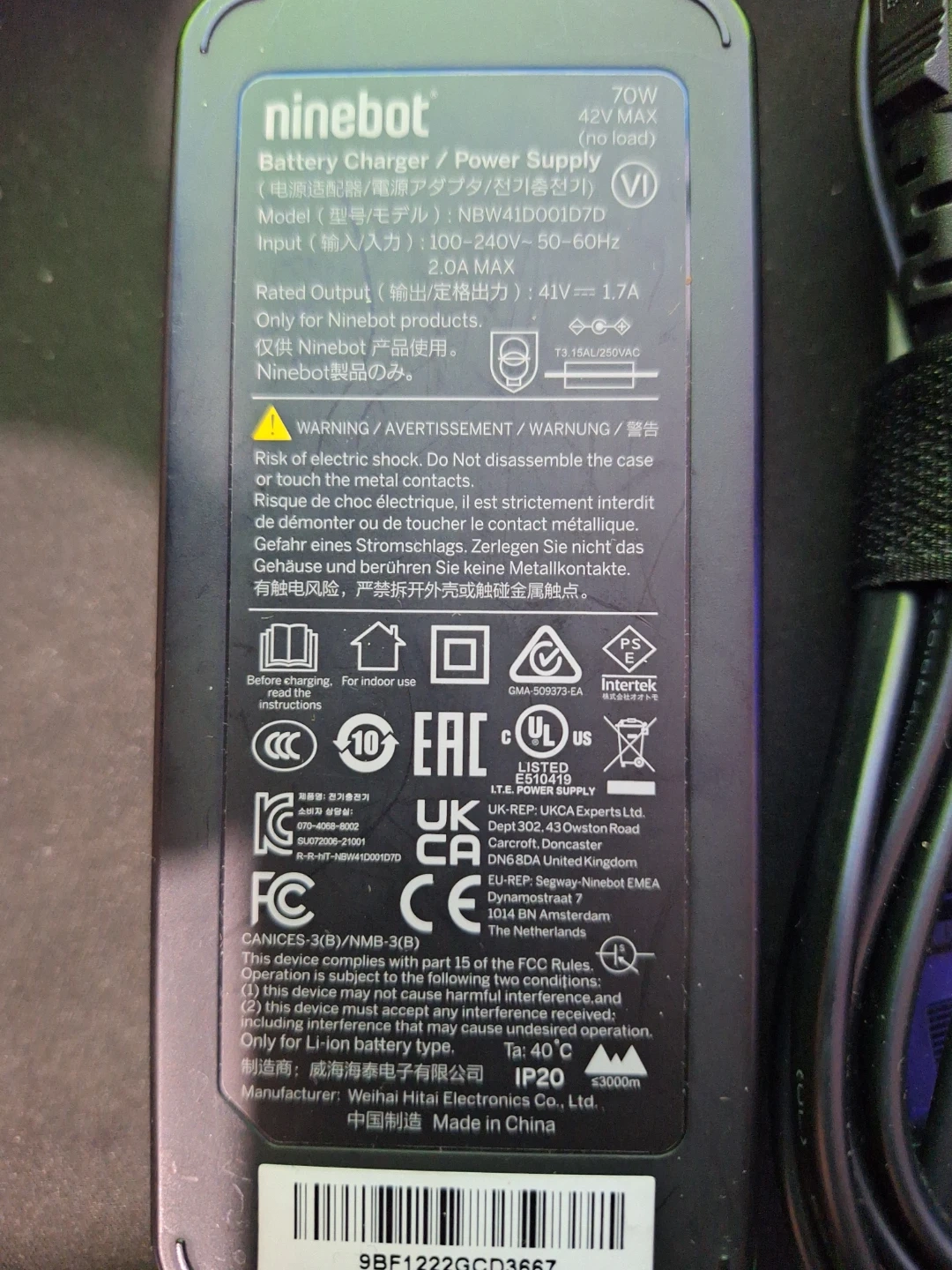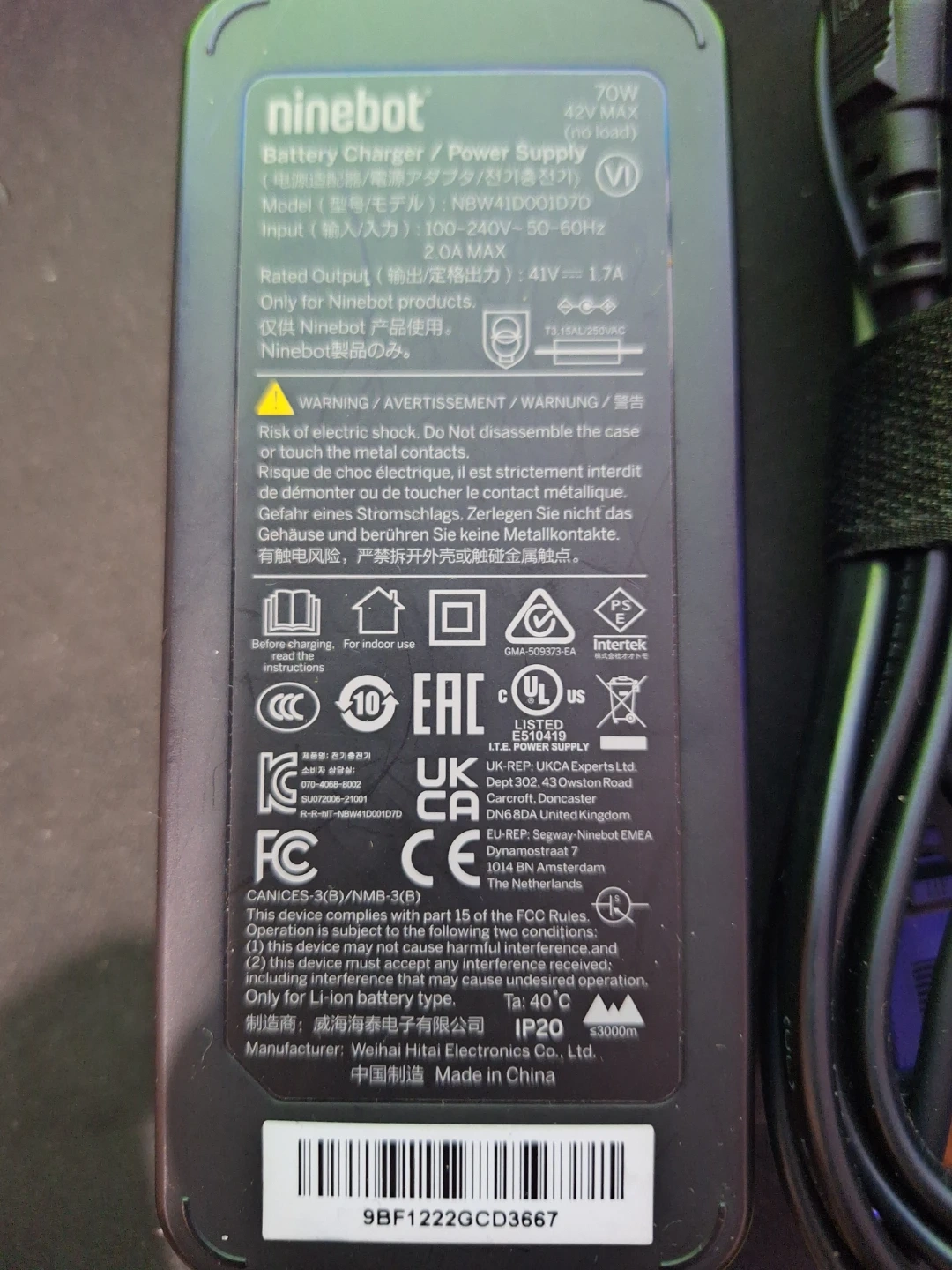 Selling a Ninebot battery charger.