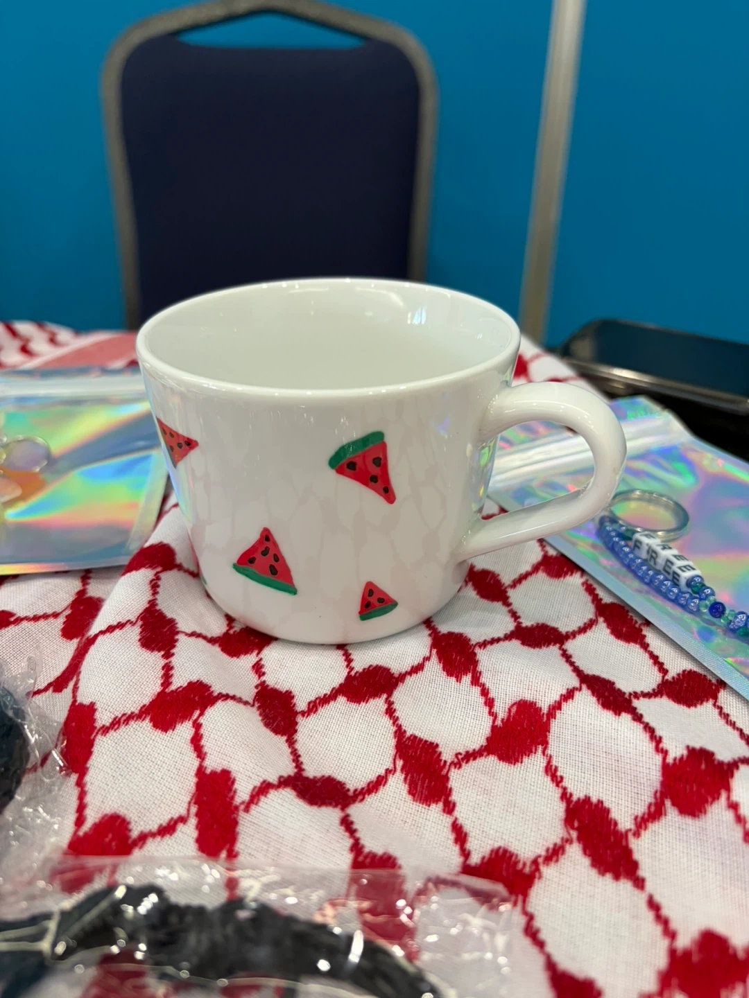 I'm selling a handmade mug with a cute watermelon design! Also included are some matching watermelon-themed accessories, like a keychain and earrings. These are perfect for adding a touch of summer to your collection.