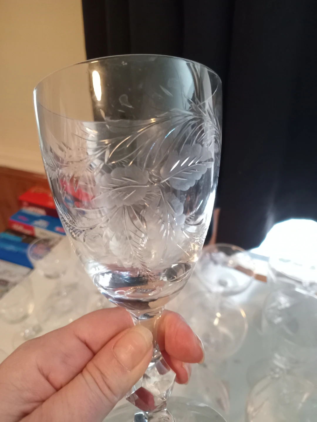 Selling a set of 24 vintage crystal wine glasses. They feature a delicate etched floral design and a unique faceted stem. These glasses would add a touch of elegance to any table setting