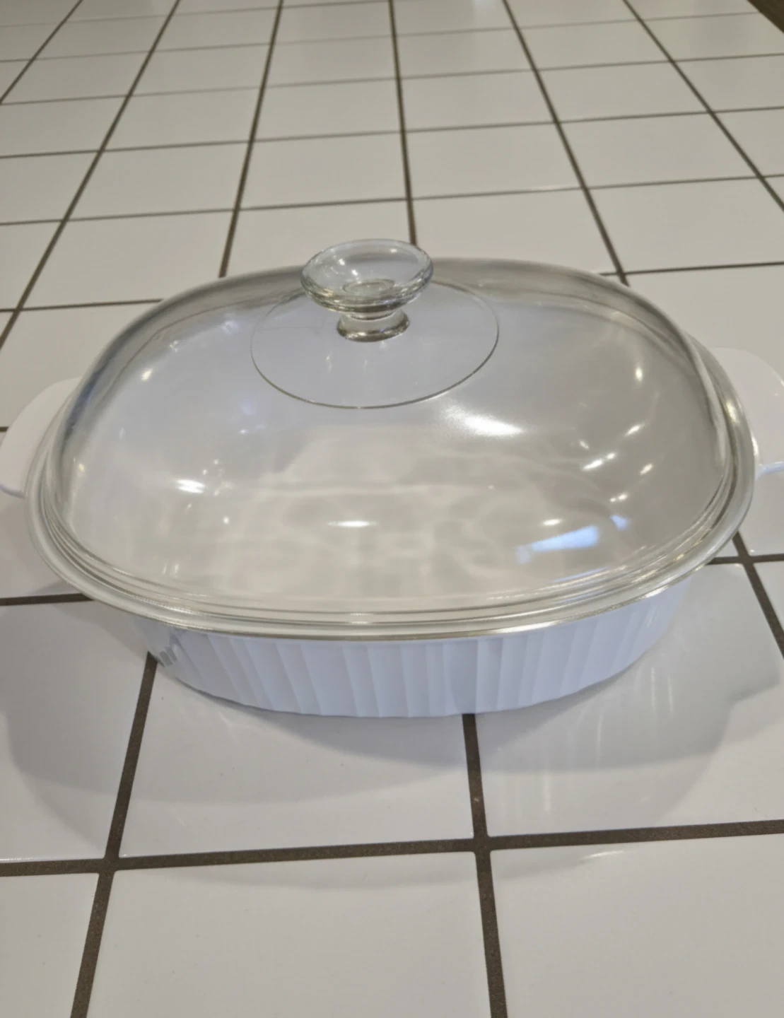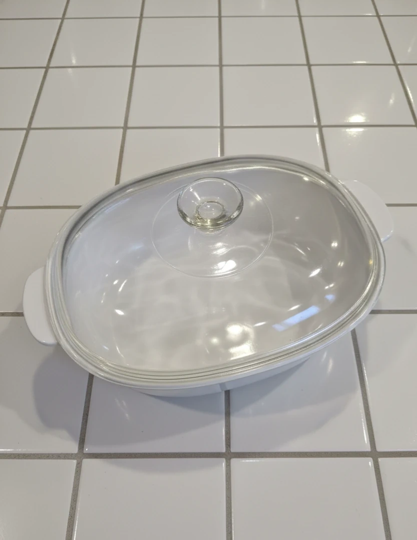 Selling a CorningWare oval casserole dish with a glass lid. It's a classic piece for any kitchen! The dish is white and in great shape. Perfect for baking and serving your favourite meals