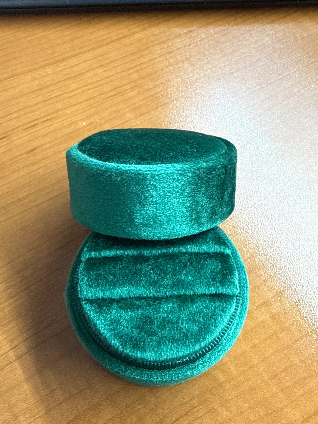 Selling a green velvet ring box! It's in great condition and perfect for storing your precious rings or other small jewelry items. The velvet material gives it a luxurious feel.