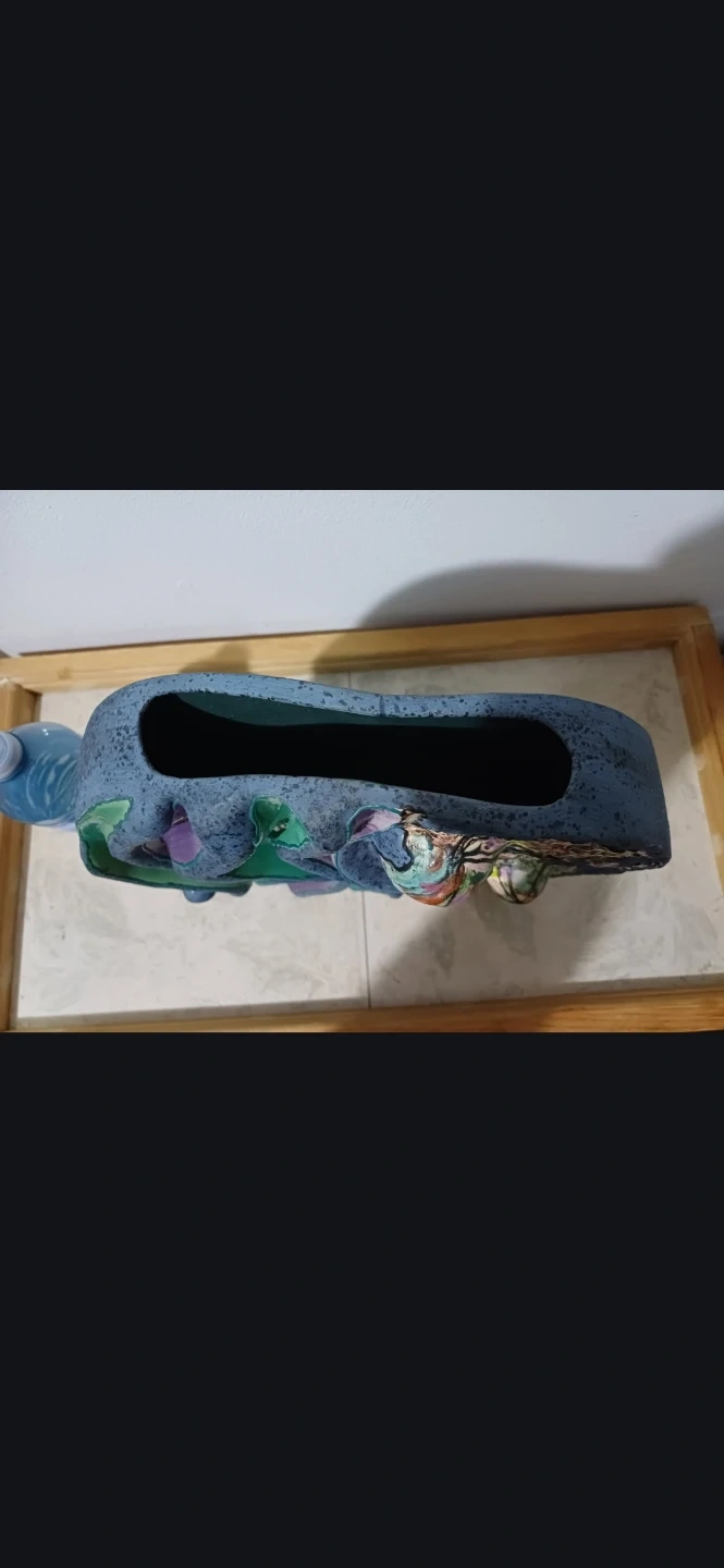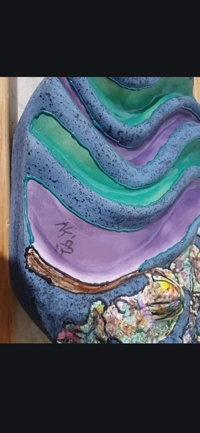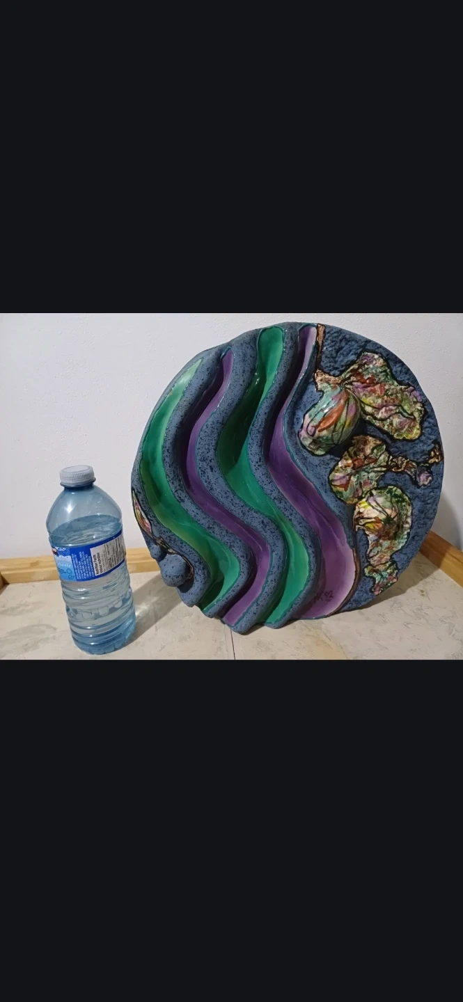Unique handmade decorative bowl/art piece with a stunning design featuring green, purple, and blue colours. Perfect as a centrepiece or for adding a touch of artistry to your home decor! It's in great condition and ready to be displayed