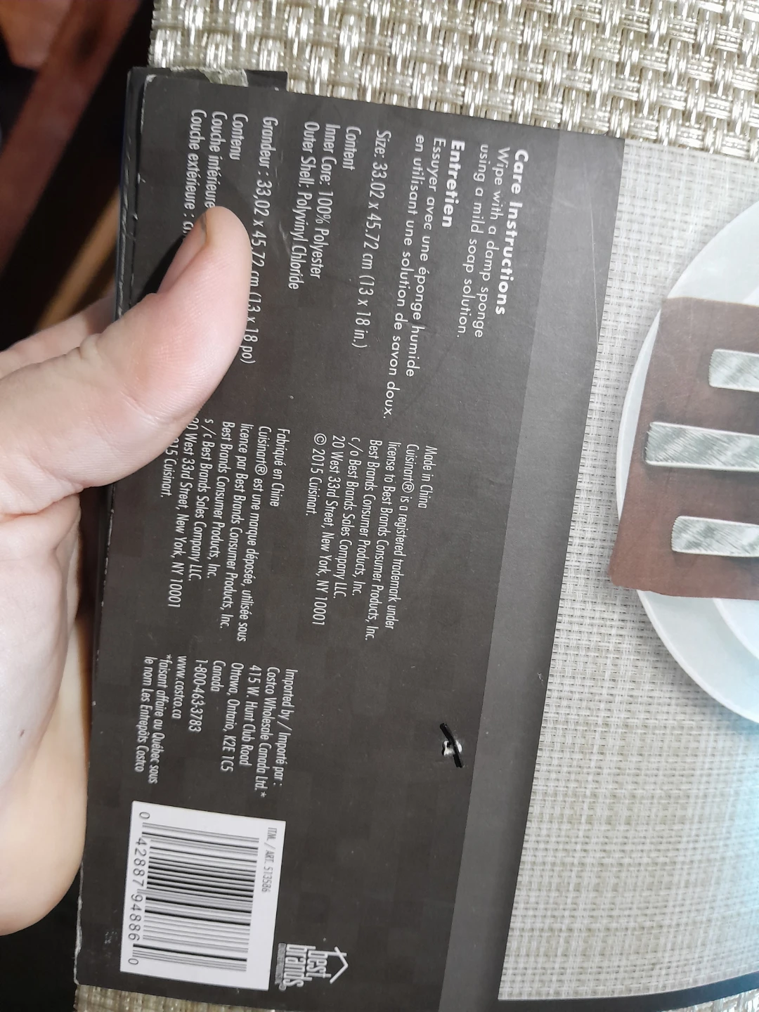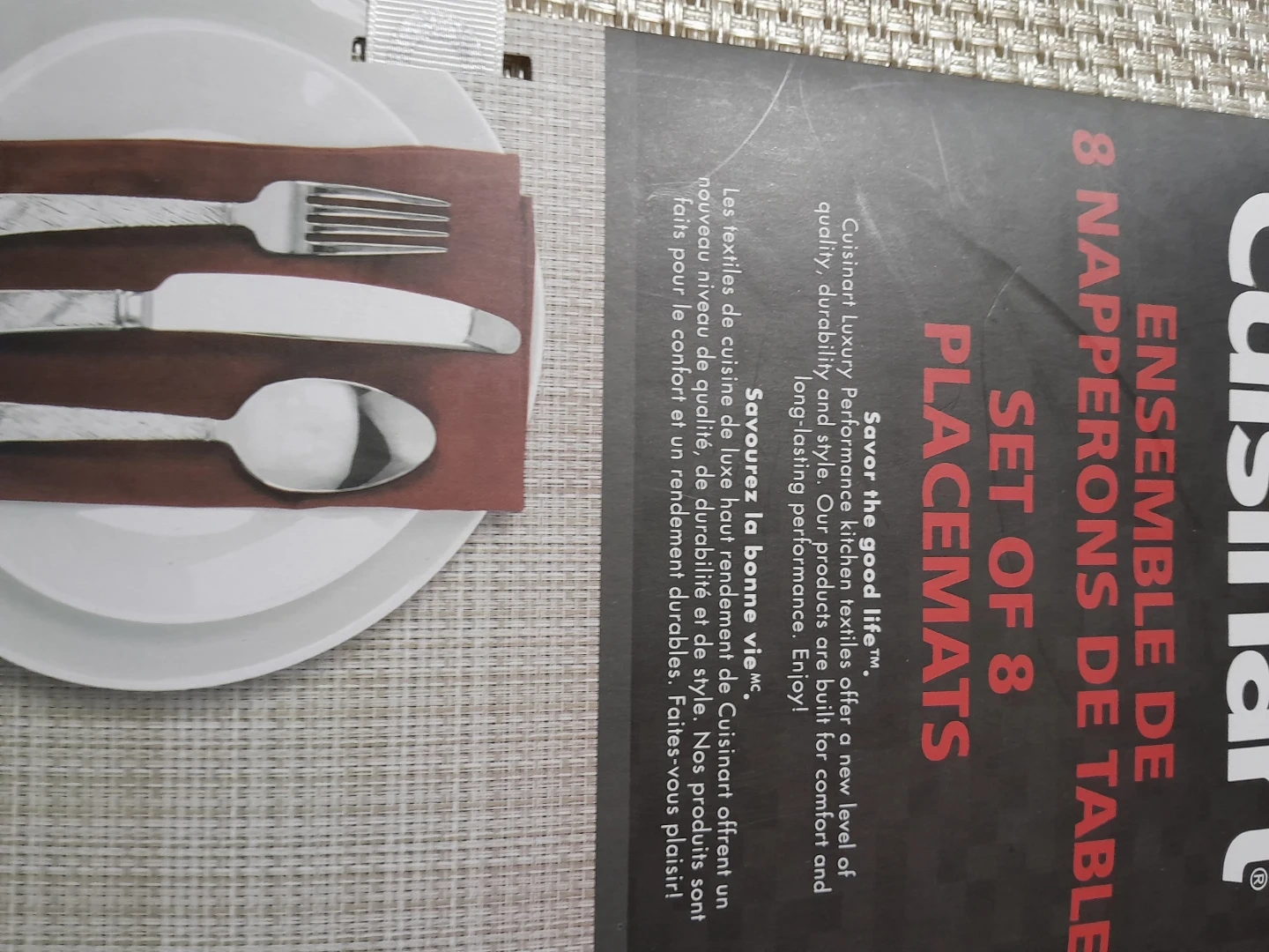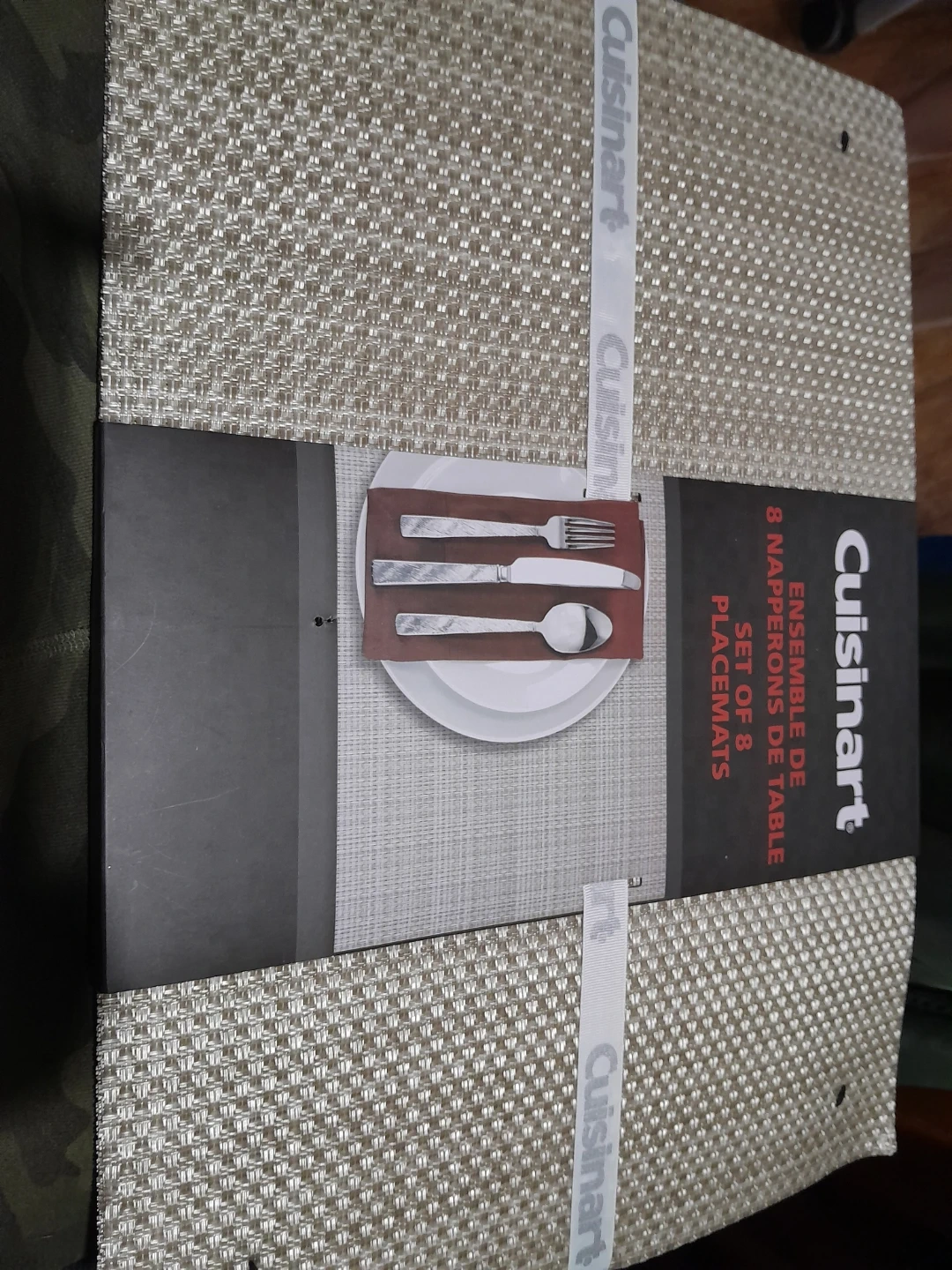 Selling a brand new set of Cuisinart placemats! This is an ensemble de 8 napperons de table. The box includes 8 placemats. Each placemat measures 33.02 x 45.72 cm (13 x 18 in). They're made with 100% polyester and outer shell of polyvinyl chloride. These luxury performance kitchen textiles offer a new level of quality, durability and style