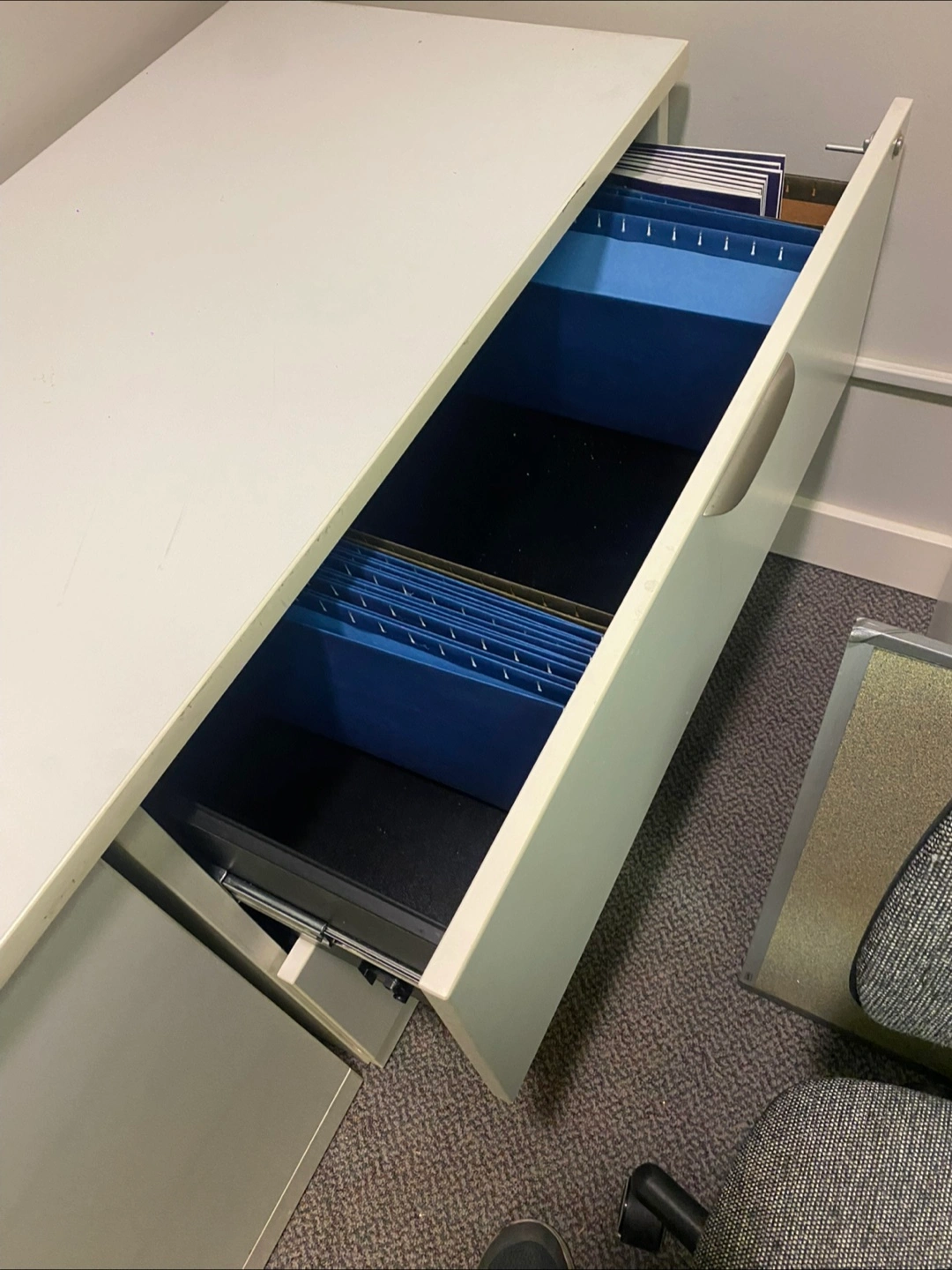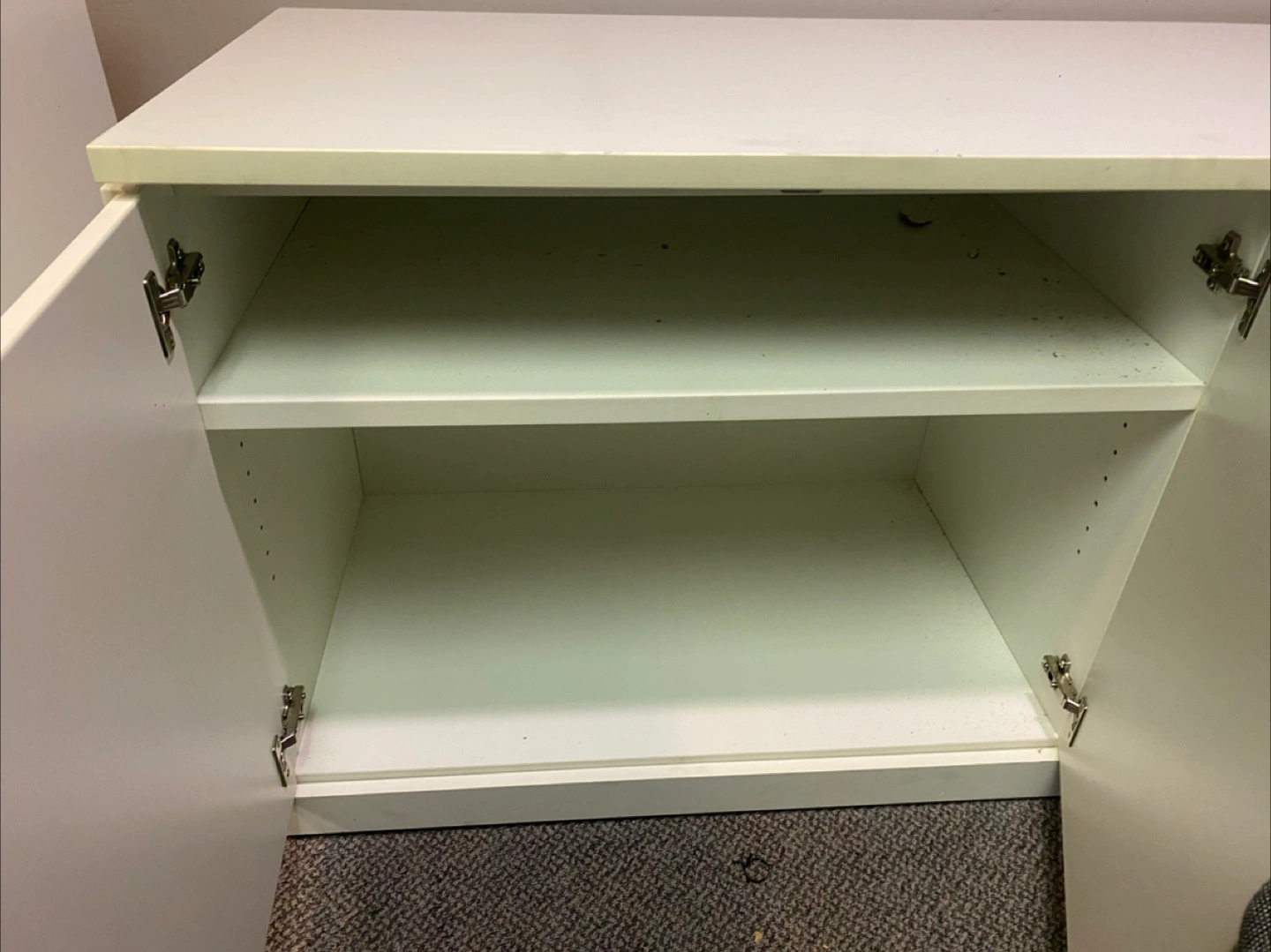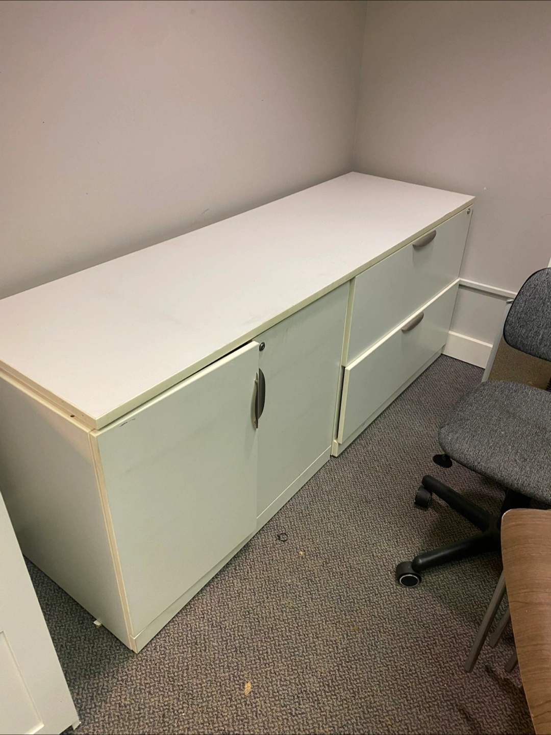 Selling a white cabinet with drawers. It's in good condition and perfect for extra storage in your home or office. It has two doors with shelves inside and two drawers.