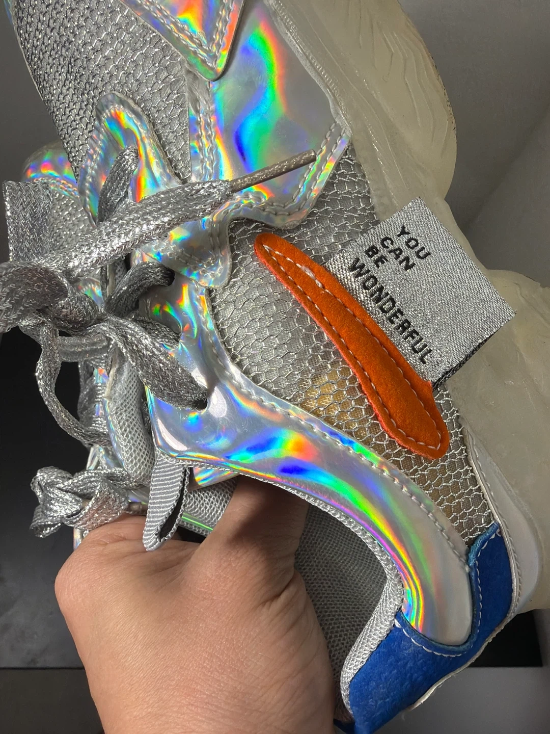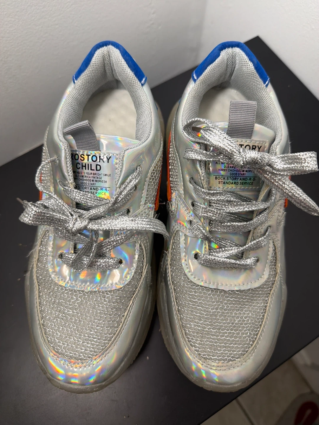 Selling a pair of Rostory Child sneakers in silver. They have a unique design with holographic accents and blue detailing. The sneakers are in good condition and ready for a new owner!