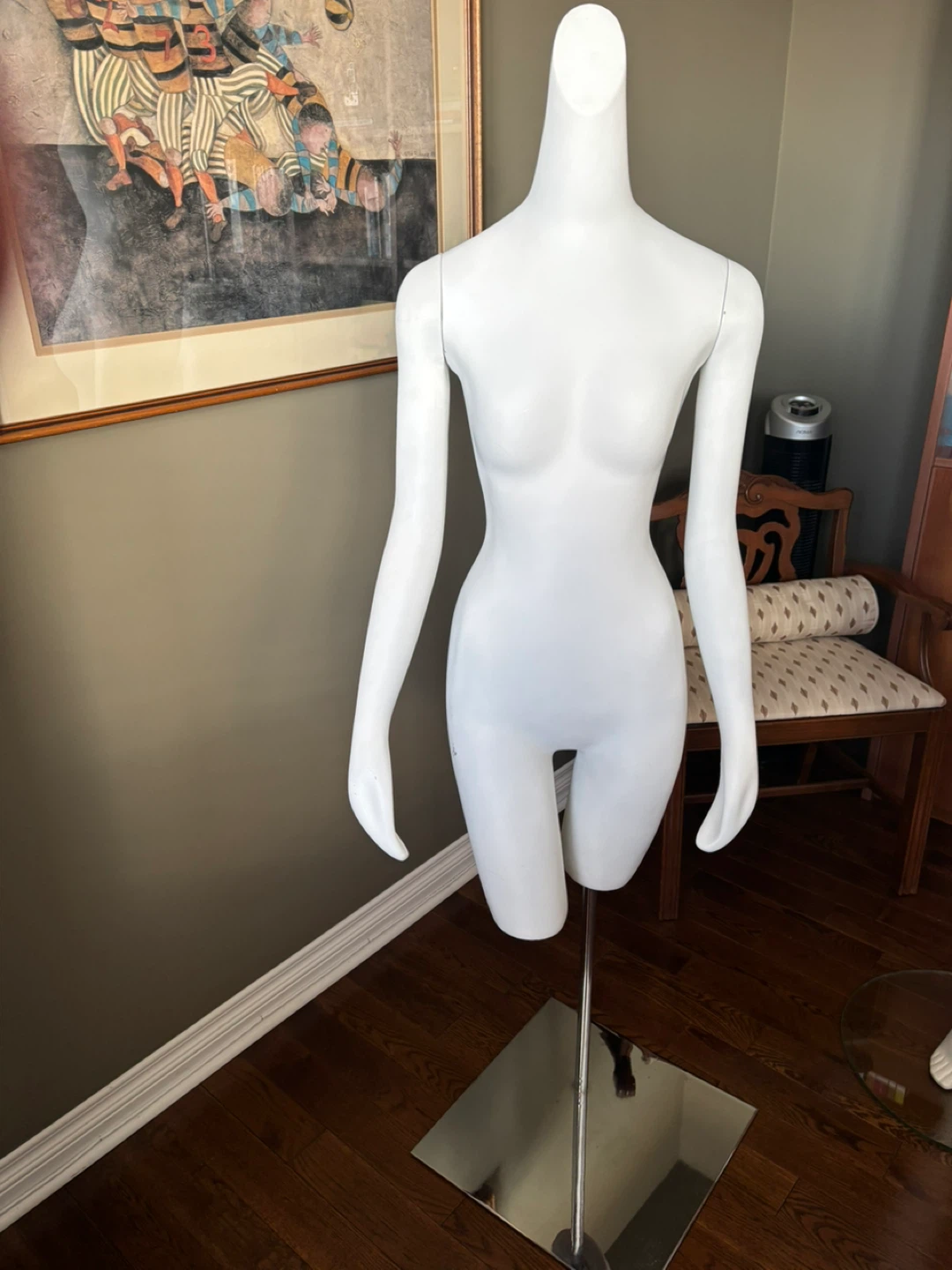 Female mannequin with a stand and mirrored base. Purchased from The Bay fixture sale. Has a few scratches as shown in the pictures. Arms are detachable and the height is adjustable.