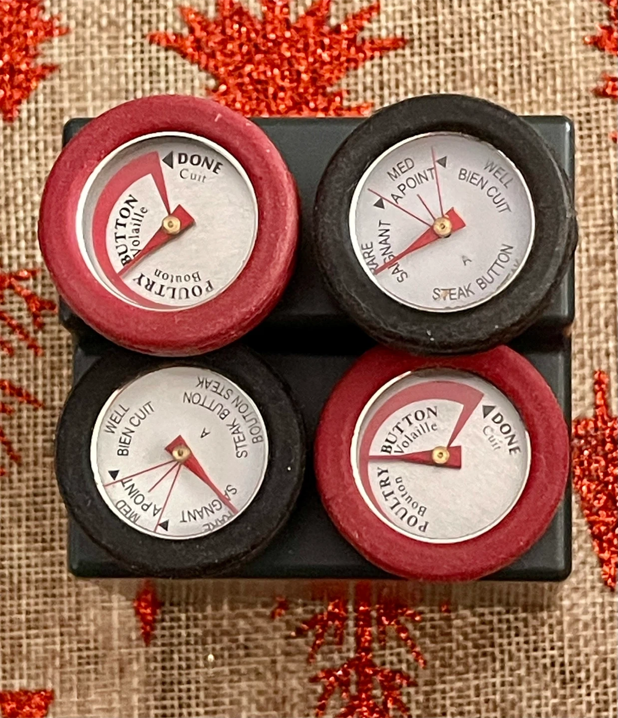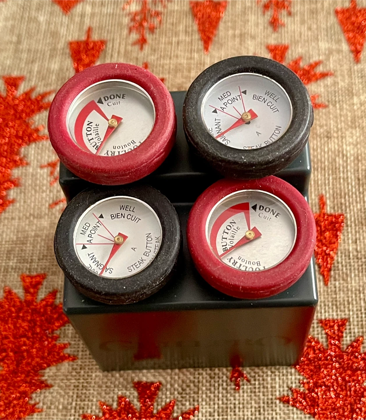 Selling a set of four GrillPro steak and poultry button thermometers! These handy gadgets help you cook your steaks and poultry to perfection, whether you like them rare, medium, or well-done. They're in new, unused condition and ready to help you grill like a pro