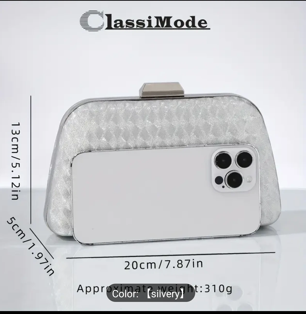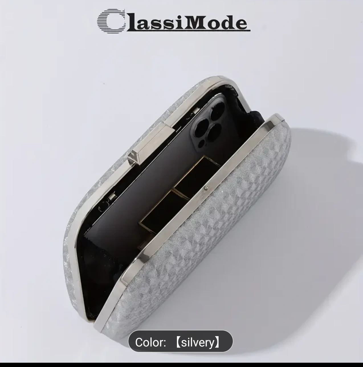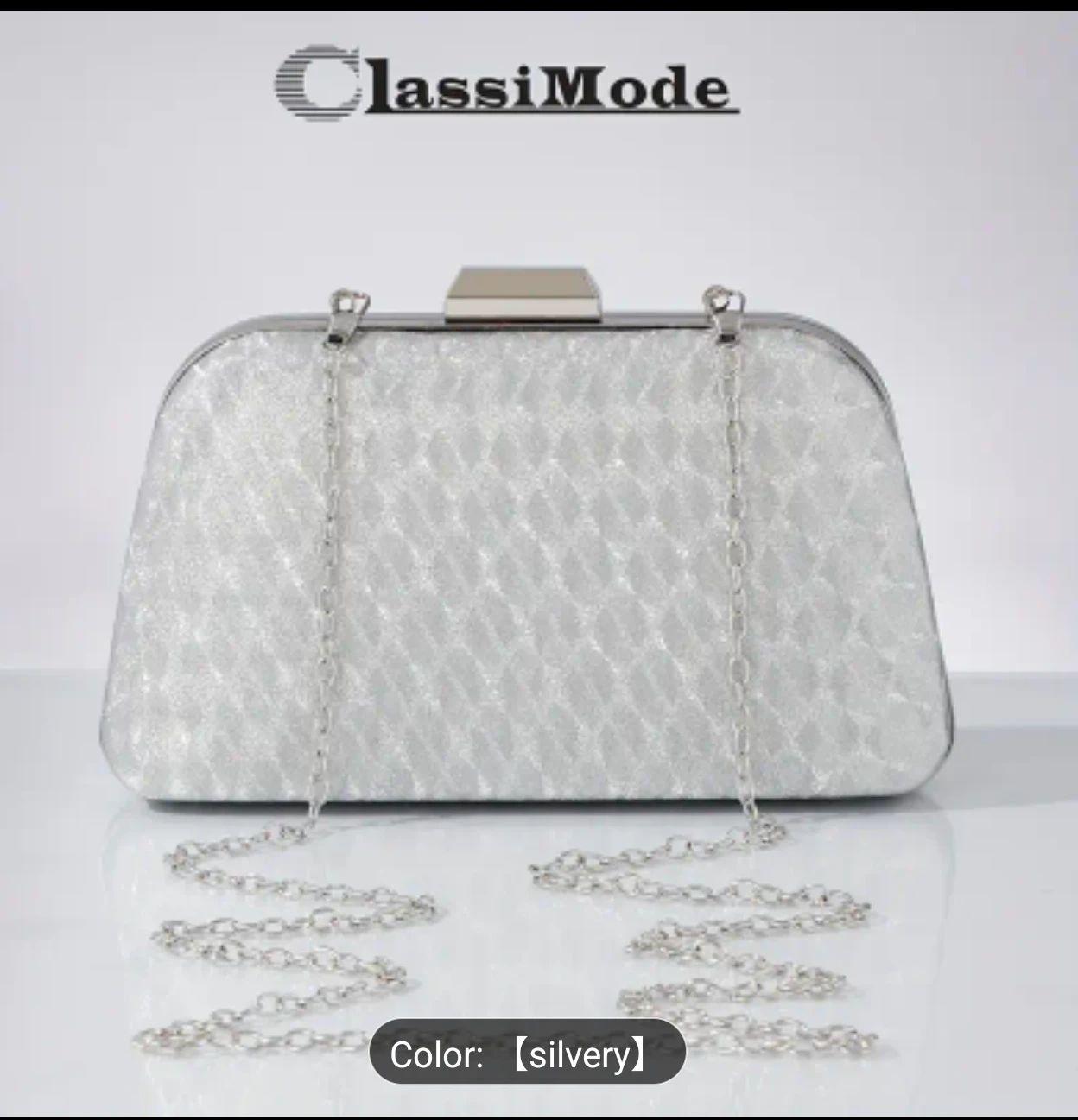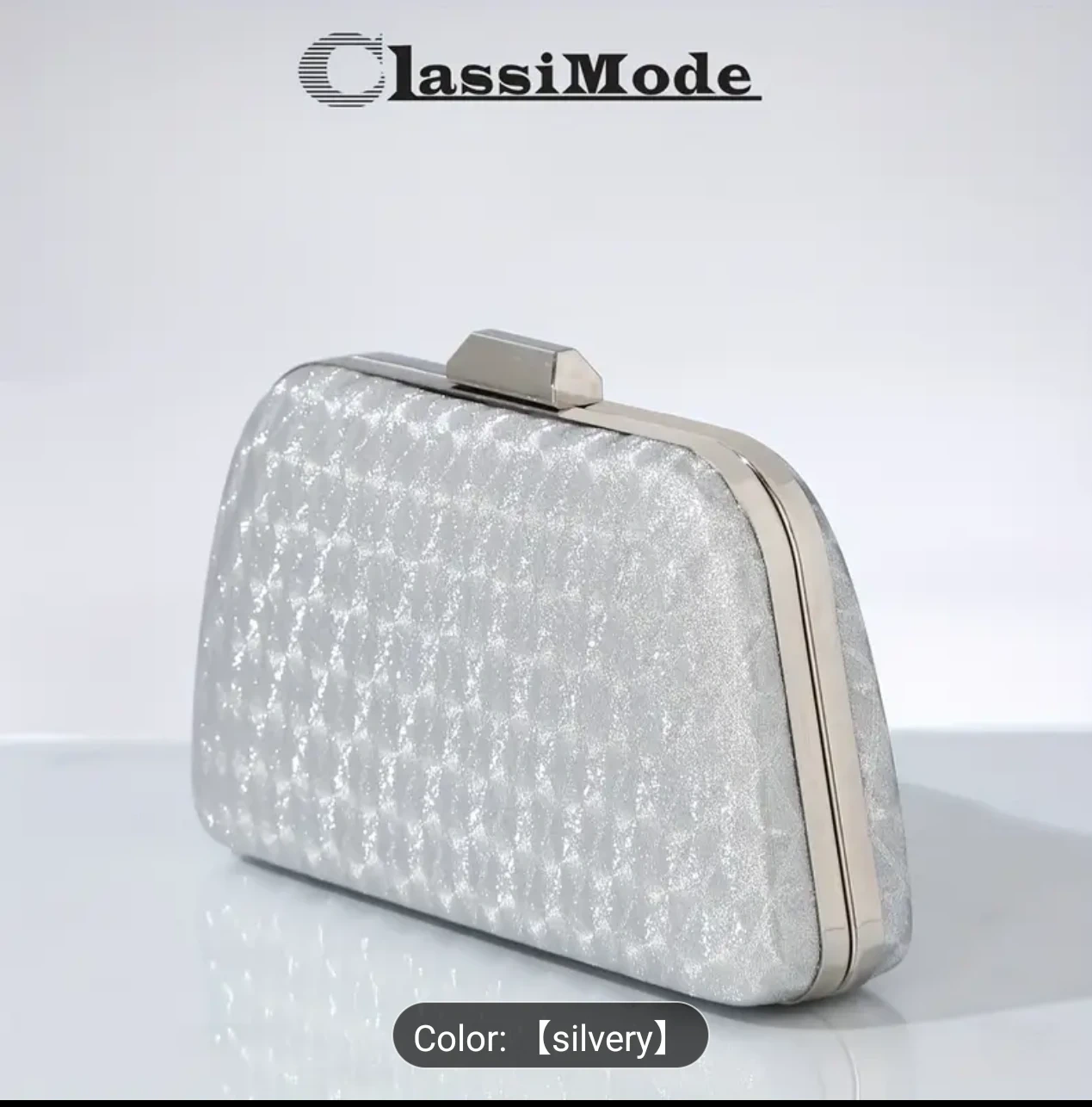 Here's a ClassiMode clutch in a lovely silver colour! It's perfect for evenings out or special occasions. It's a stylish and compact accessory to complete your look.