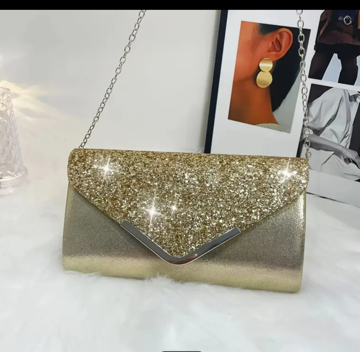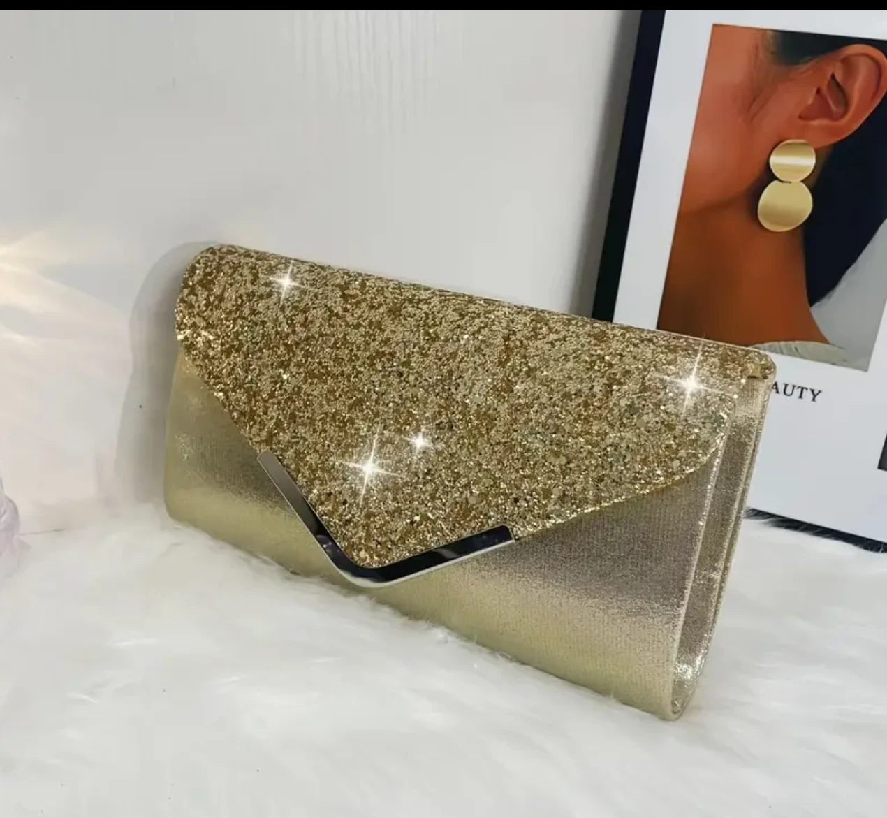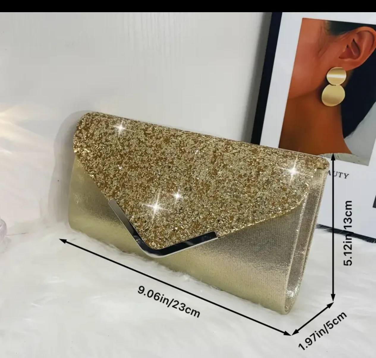 Selling a gorgeous gold glitter evening clutch purse! It's perfect for a night out or a special occasion. The approximate dimensions are 9.06 inches (23 cm) in length, 5.12 inches (13 cm) in height, and 1.97 inches (5 cm) in width.