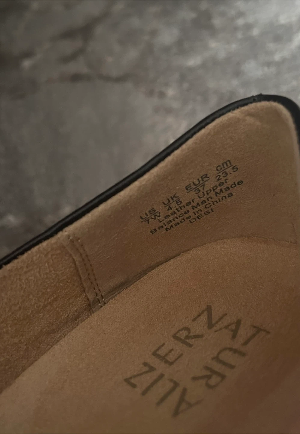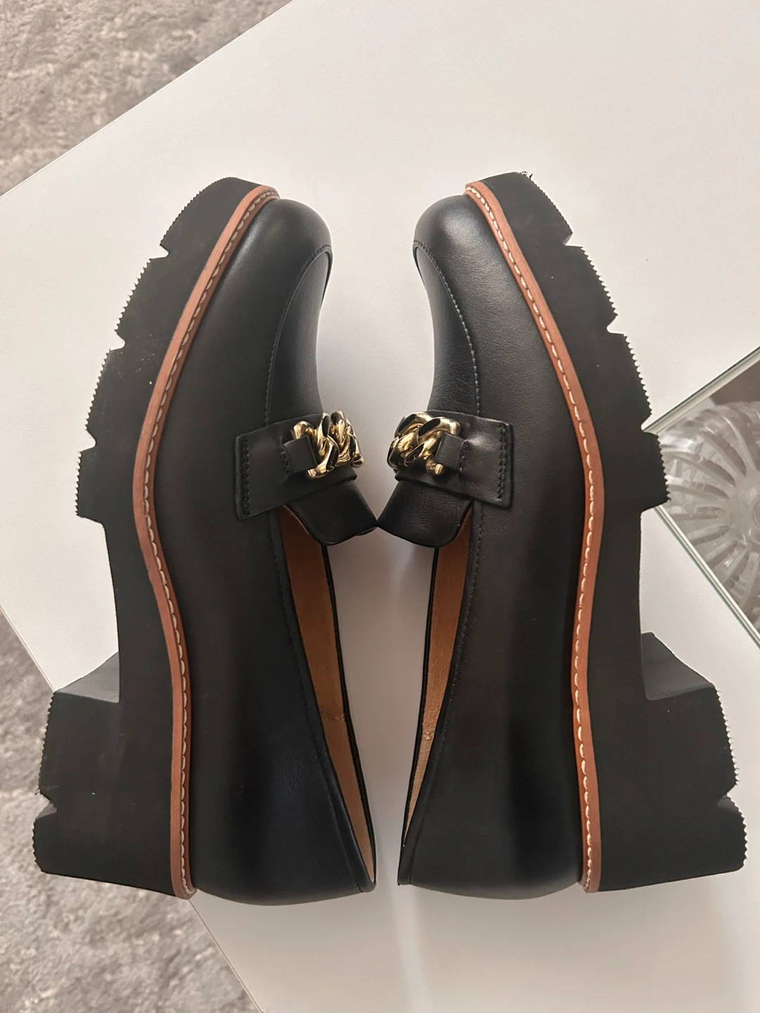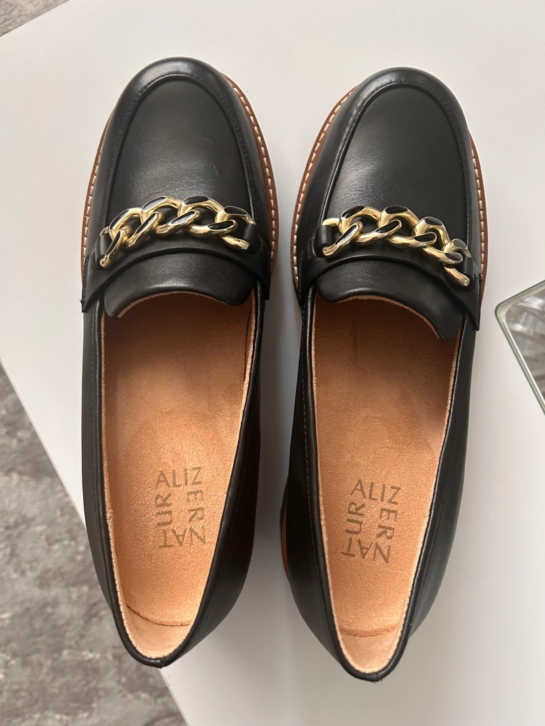 Selling a pair of new black leather loafers from Naturalizer. They are a size 7W (US). These stylish loafers feature a gold chain detail and a comfortable sole. Perfect for adding a touch of elegance to any outfit!