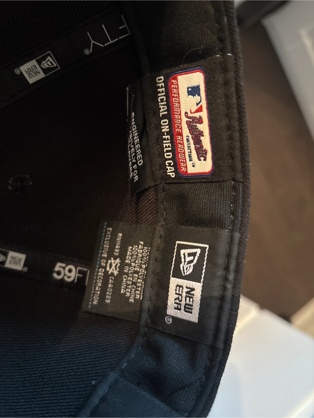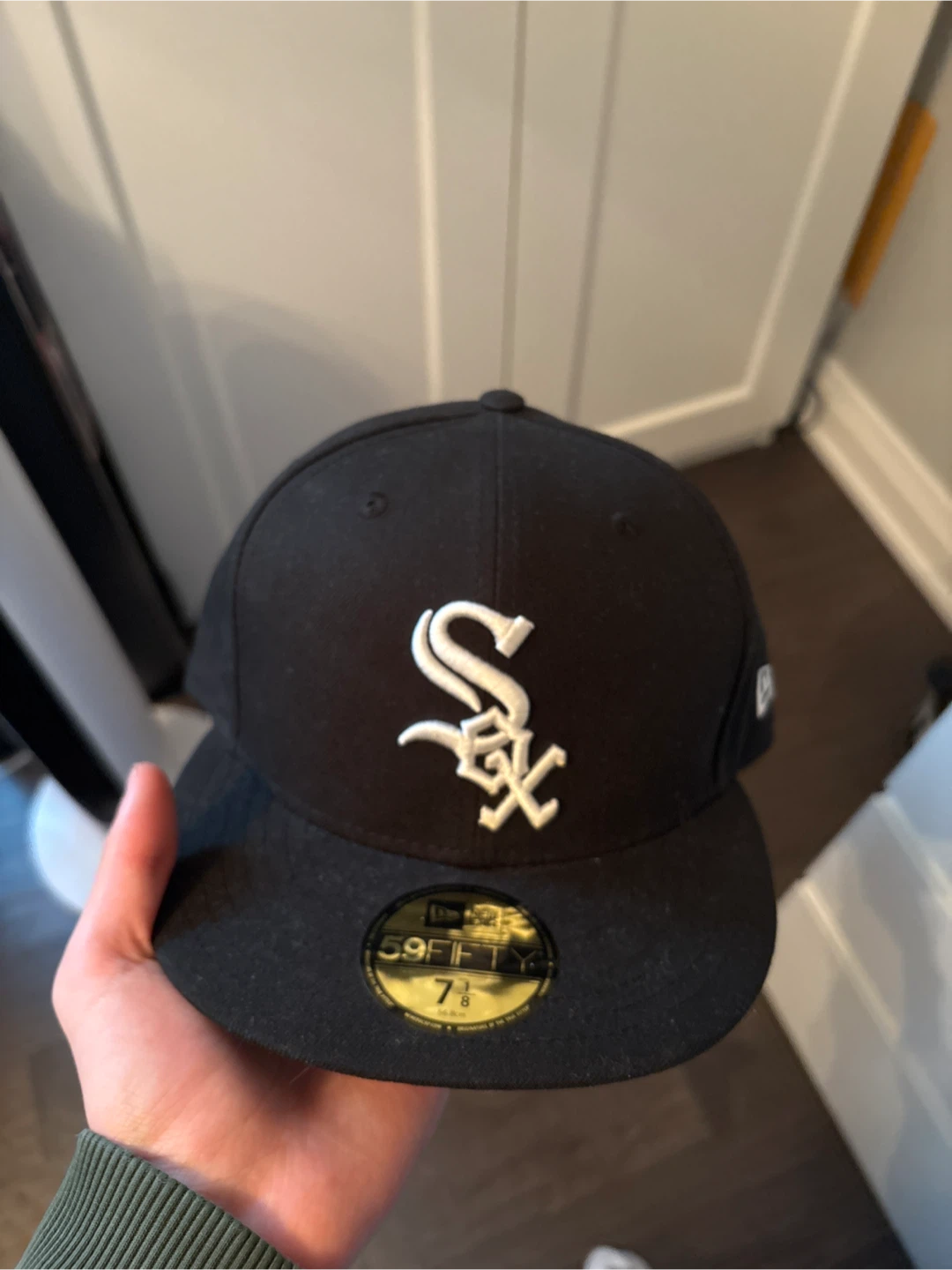 Here's a New Era Chicago White Sox 59FIFTY fitted hat in size 7 1/8. It's black with a white logo. The hat is made of 100% polyester.