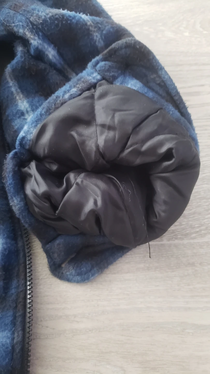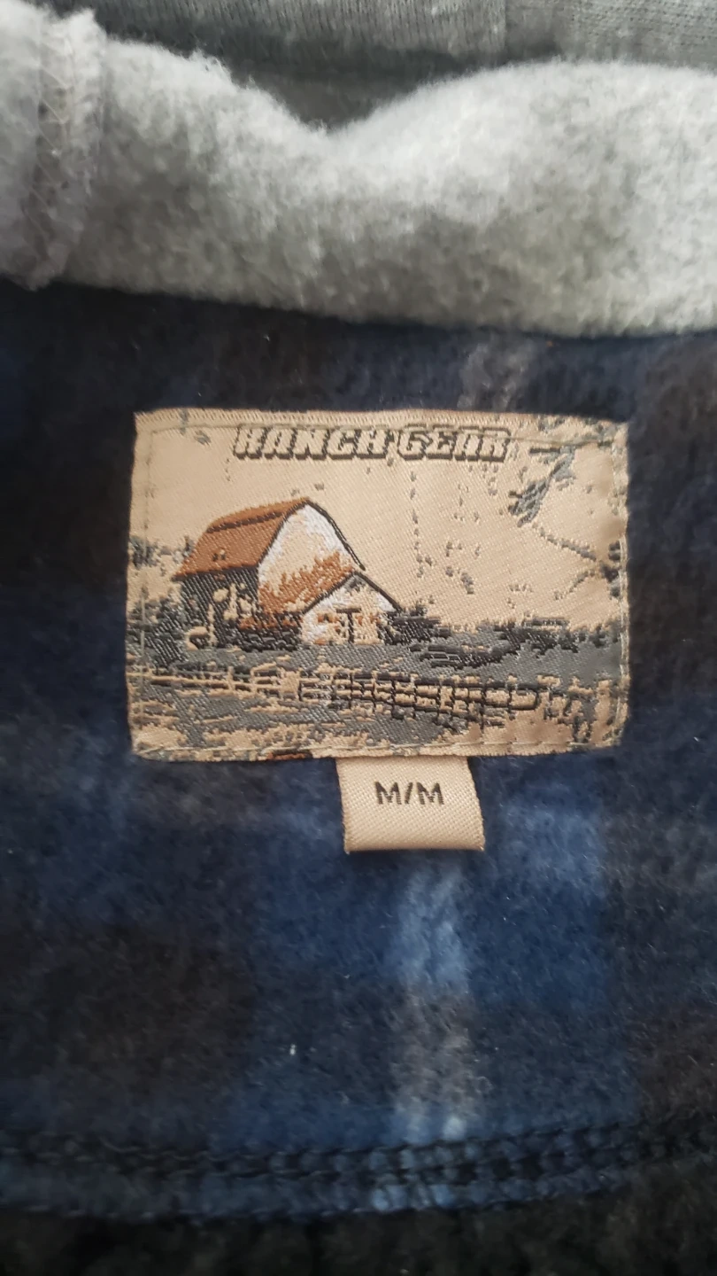 Cozy Ranch Gear hooded flannel jacket in size M! It's blue and black plaid with a soft, sherpa-like lining. Perfect for staying warm on chilly days!