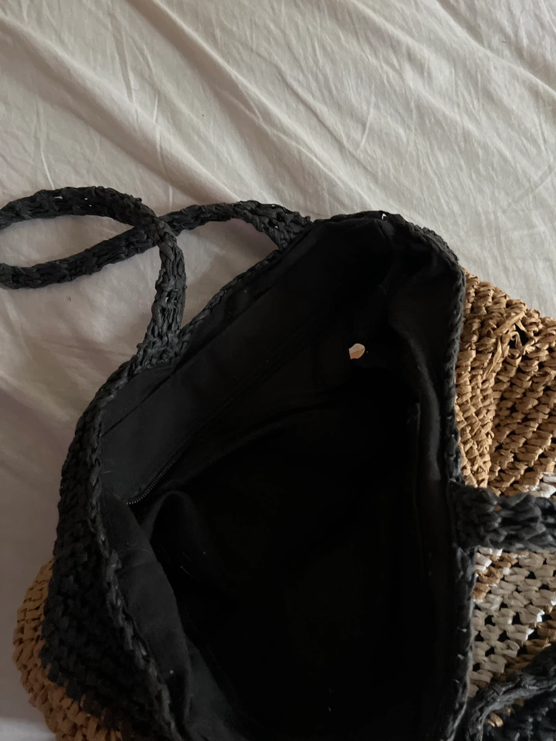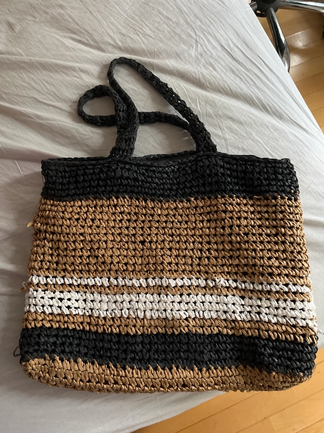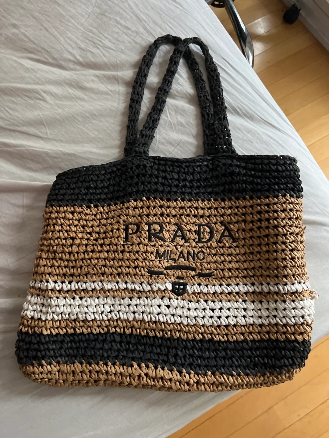 Selling a Prada Milano tote bag. It's made of straw and features a black, brown, and white striped pattern. Great for summer! Not in need anymore, perfect condition.