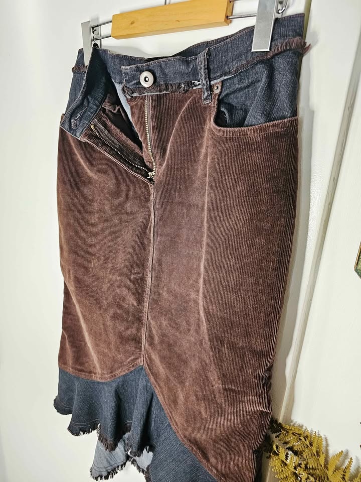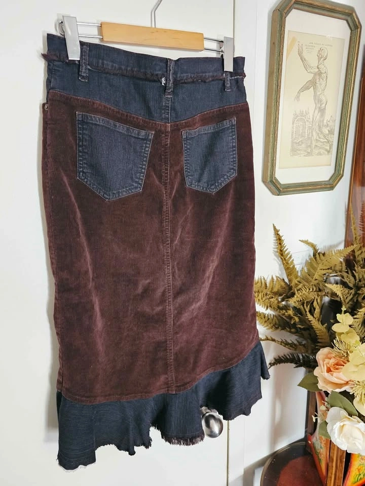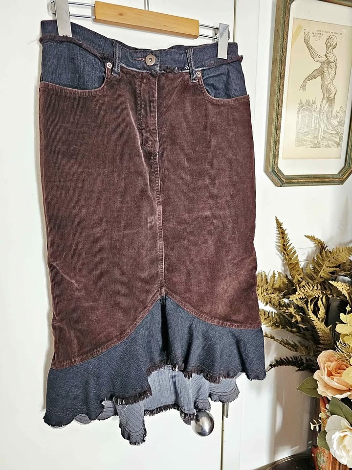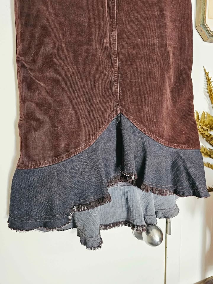 Vintage Y2K late 90s to 2000s BEDO patchwork midi skirt featuring rich chocolate brown corduroy, black denim contrast panels, and a raw frayed mermaid style ruffle hem. Well-made fabric with lots of stretch for comfort. Perfect styled with platform boots, corsets, mesh tops, or leather layers, for whimsigoth or grunge looks.