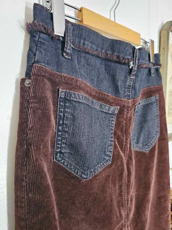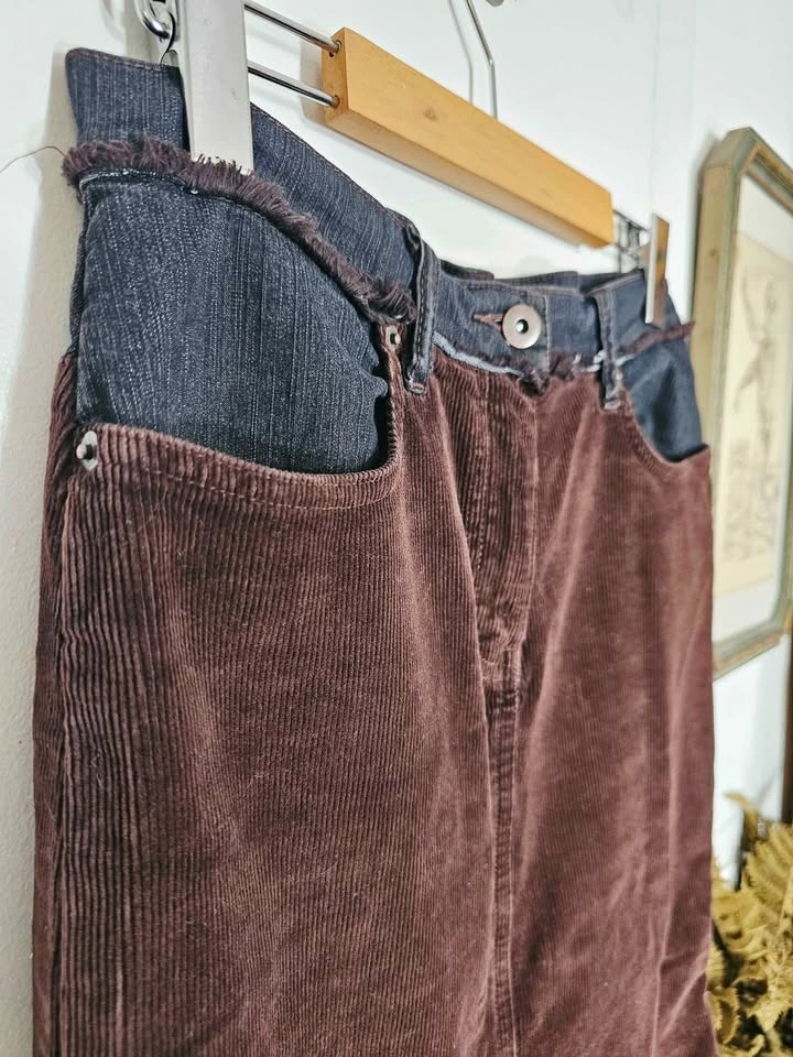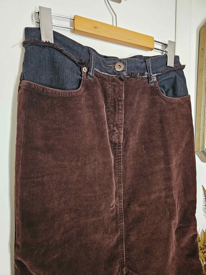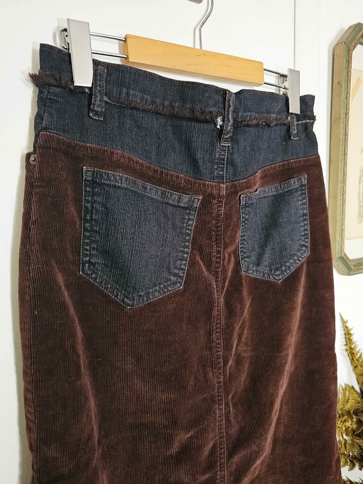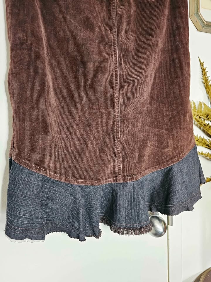 Vintage Y2K late 90s to 2000s BEDO patchwork midi skirt featuring rich chocolate brown corduroy, black denim contrast panels, and a raw frayed mermaid style ruffle hem. Well-made fabric with lots of stretch for comfort. Perfect styled with platform boots, corsets, mesh tops, or leather layers, for whimsigoth or grunge looks.