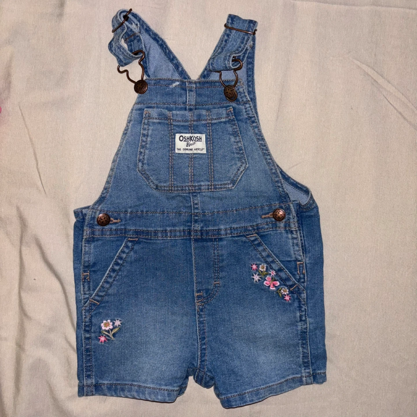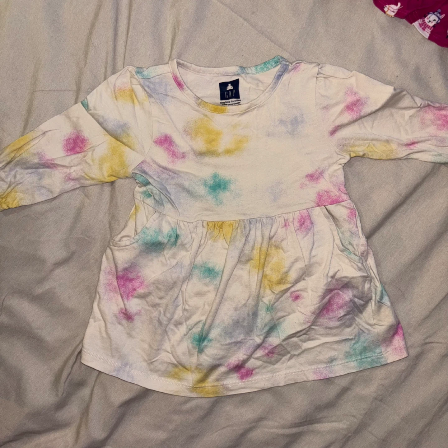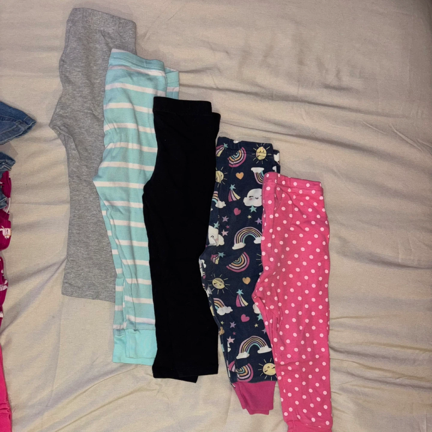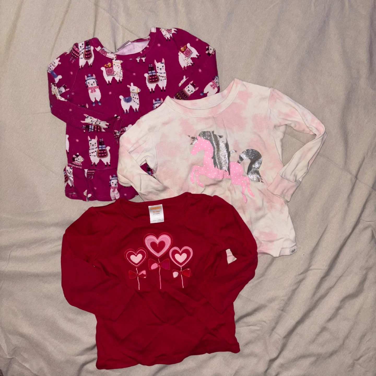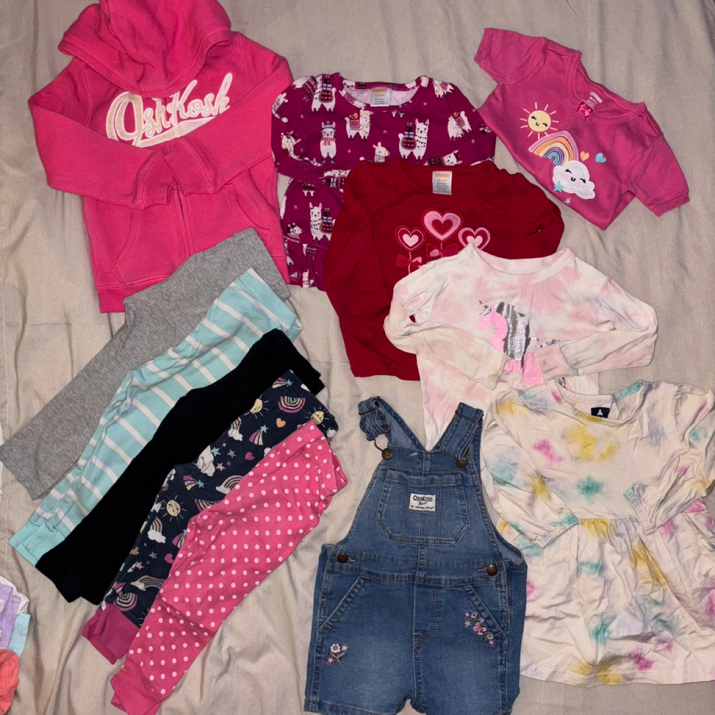 A mixed bundle of baby clothes including leggings, shirts, and overalls! 18-24m. The brands included are OshKosh and Gap. Perfect for a growing little one!