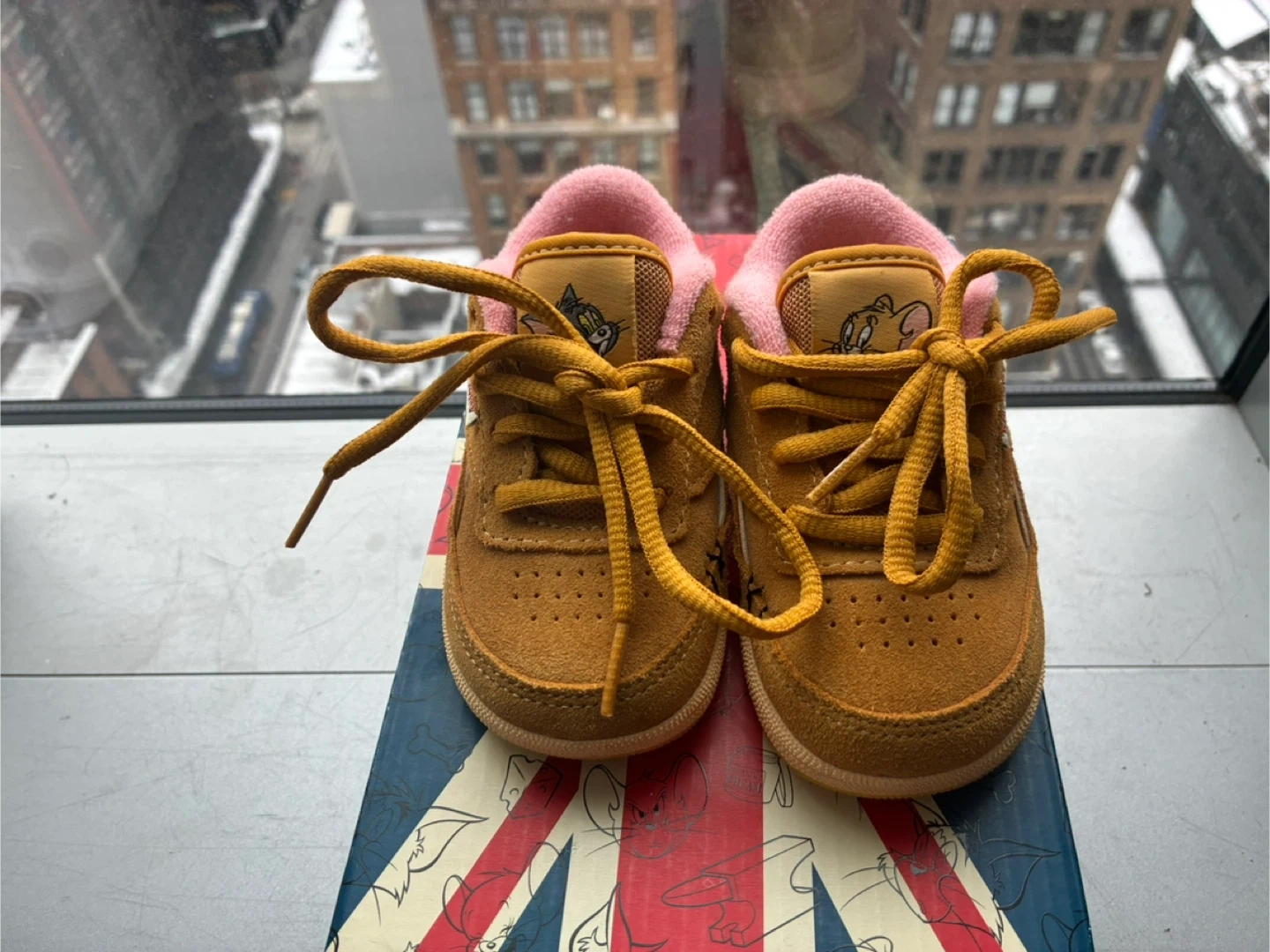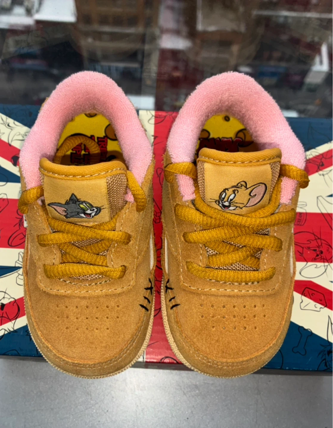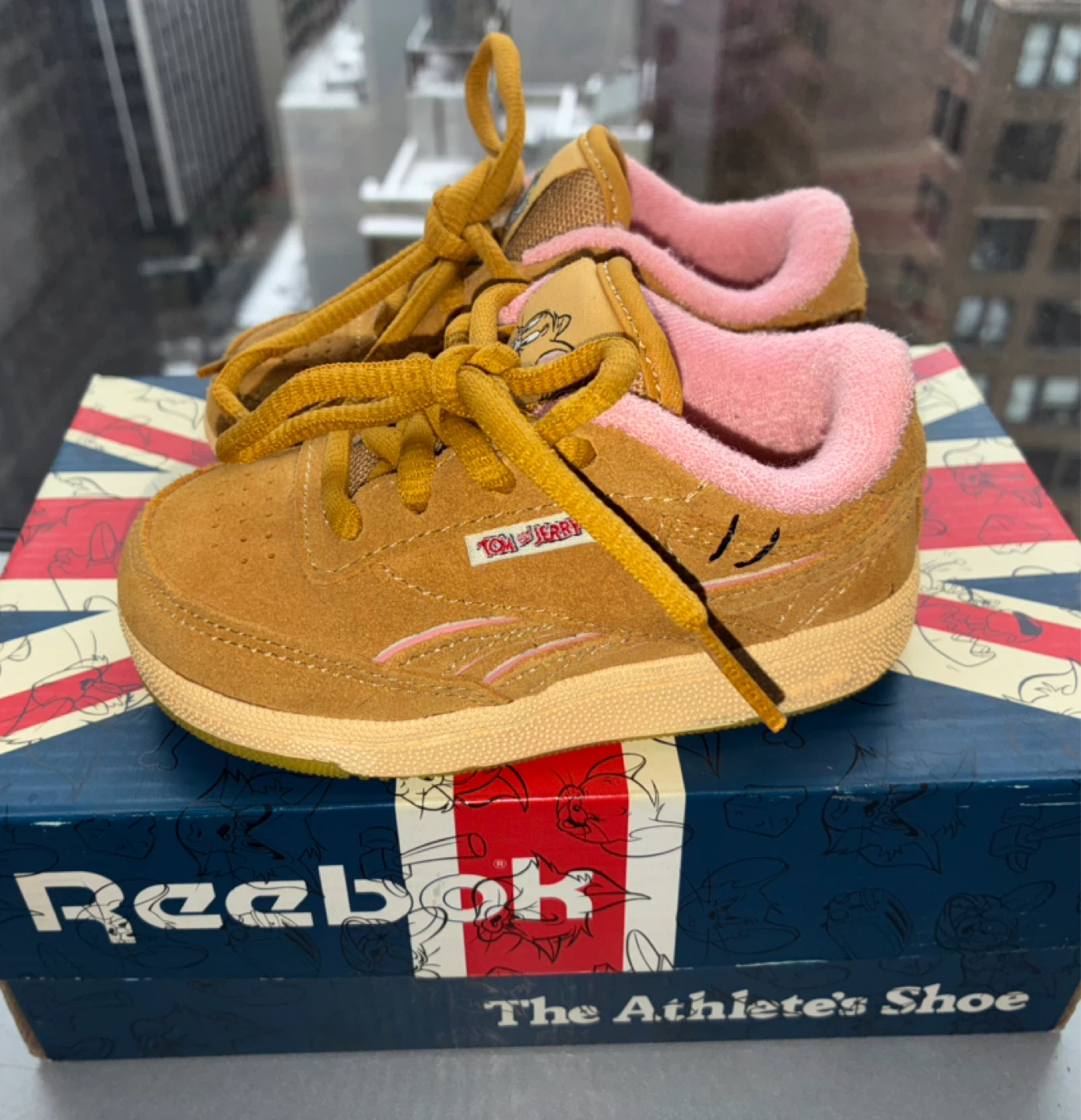 Super cute Reebok toddler shoes featuring Tom & Jerry! The shoes are a tan color with pink interior lining. They come with the original box, perfect for your little one!