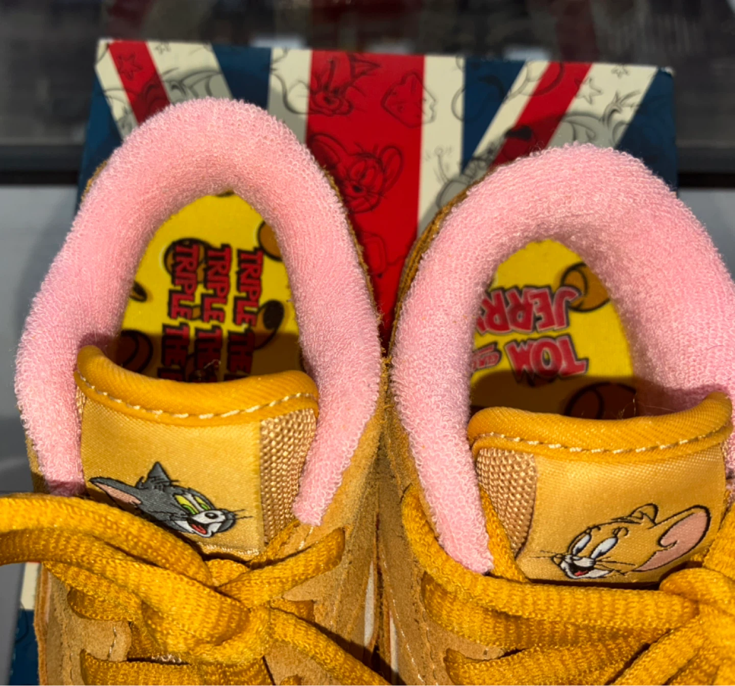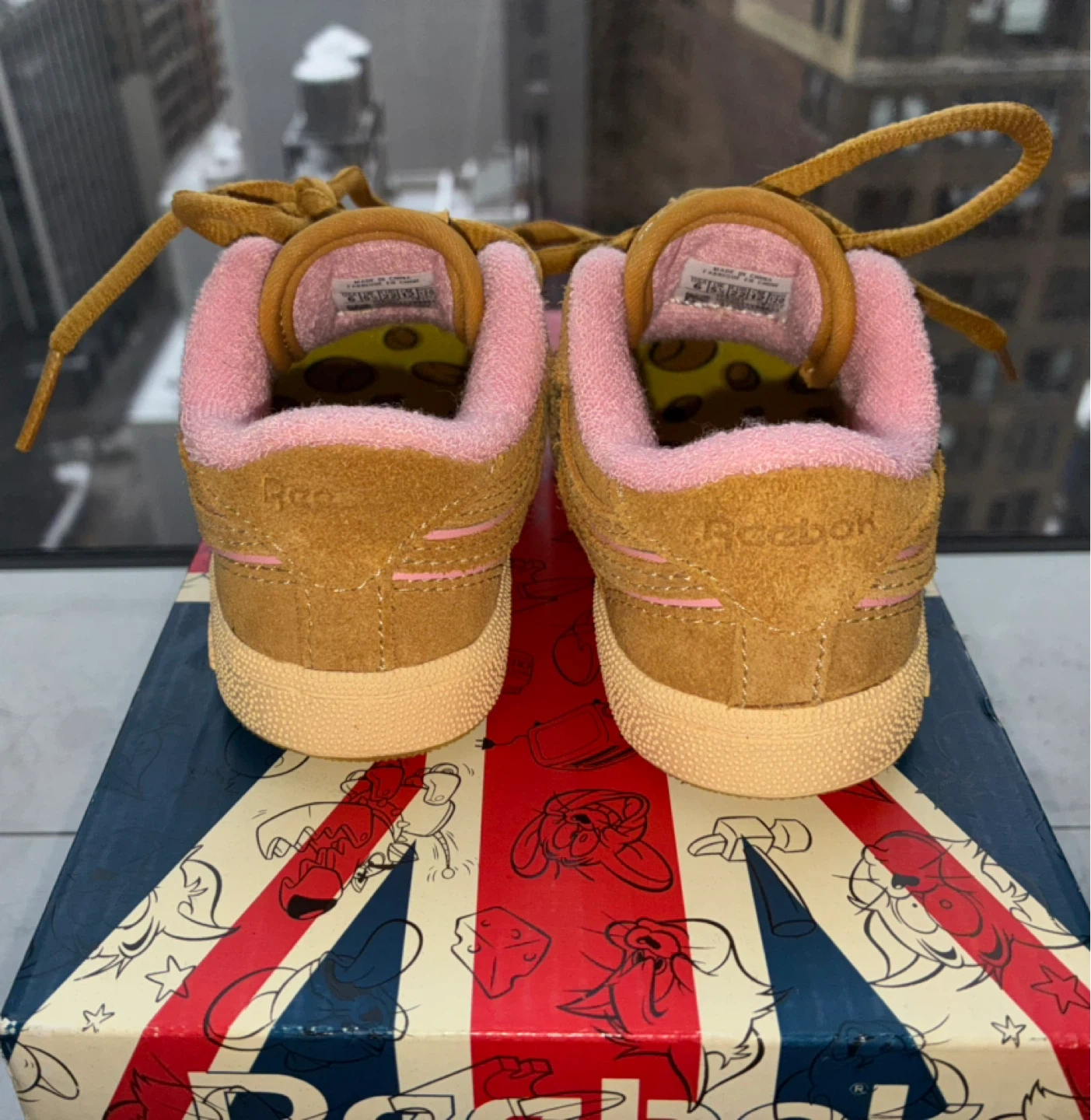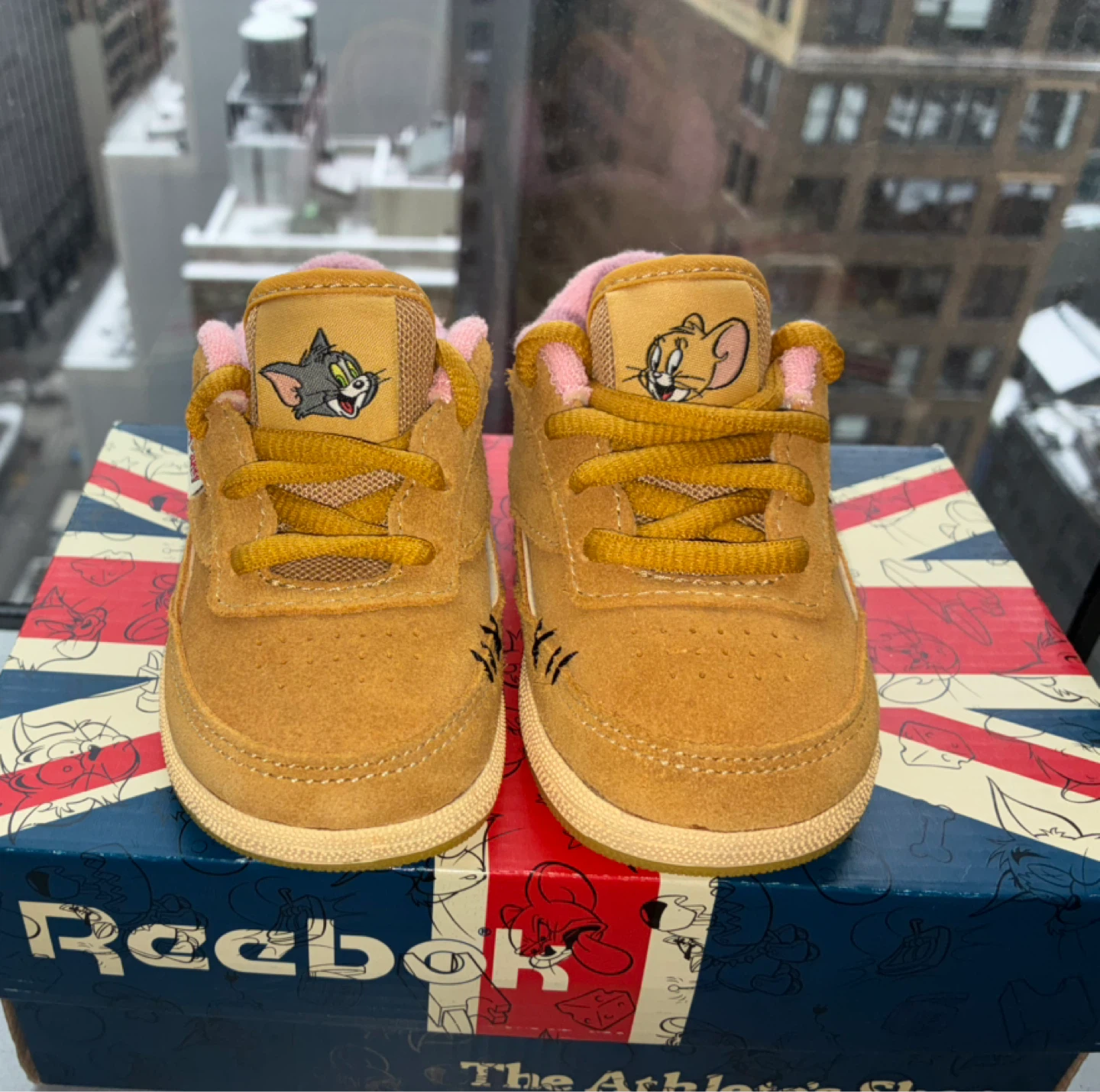 Super cute Reebok toddler shoes featuring Tom & Jerry! The shoes are a tan color with pink interior lining. They come with the original box, perfect for your little one!