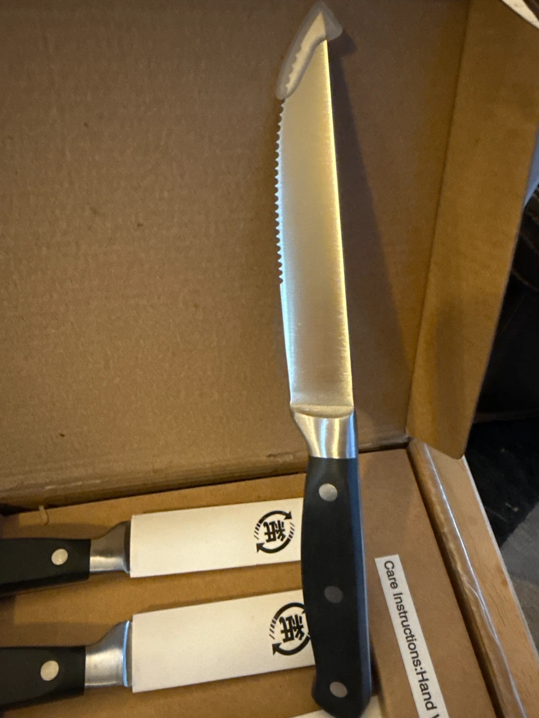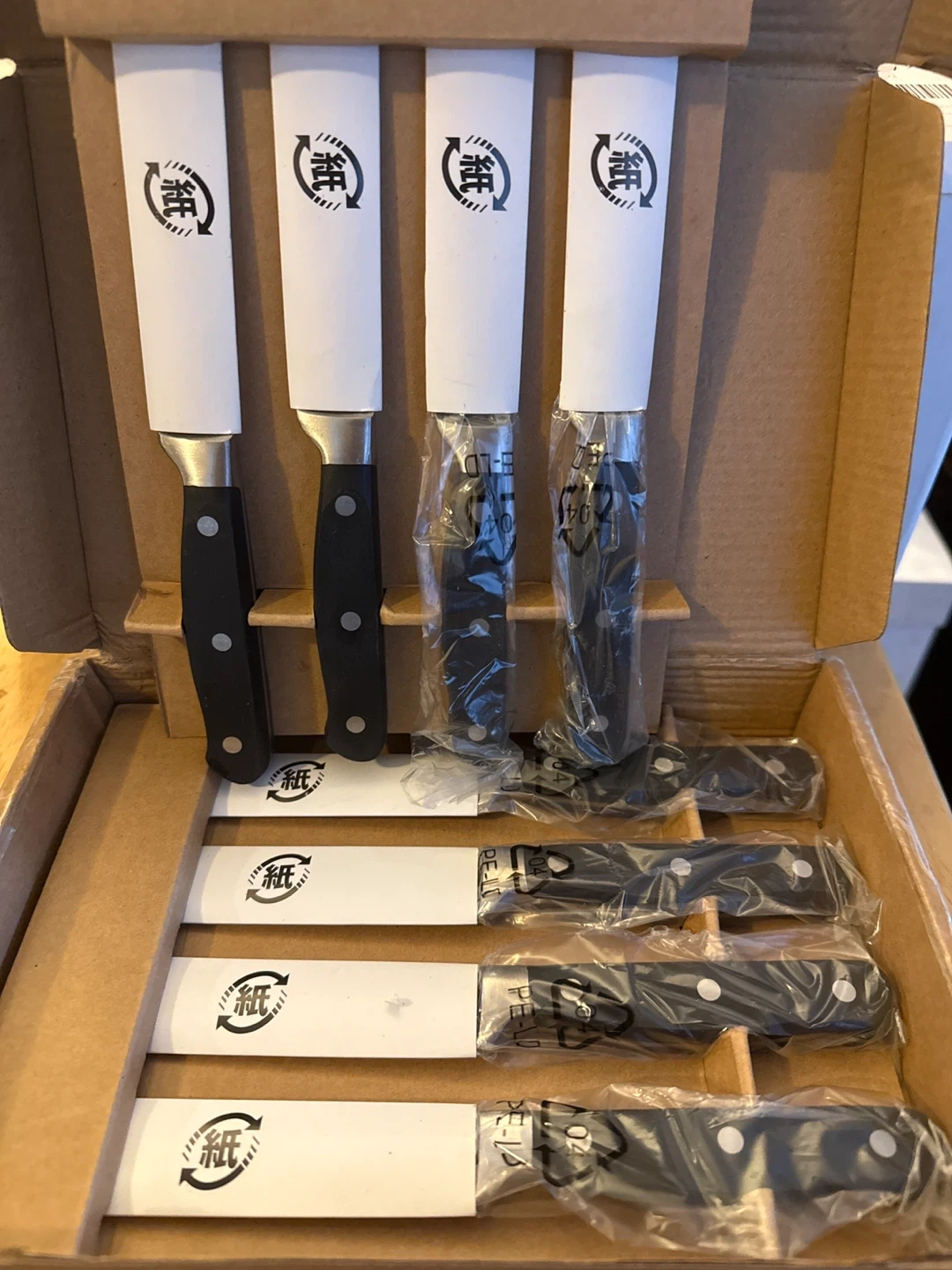 Selling a brand new AmazonBasics 8-piece steak knife set! These knives are still in their original packaging and box. They are hand wash only. Perfect for any kitchen!