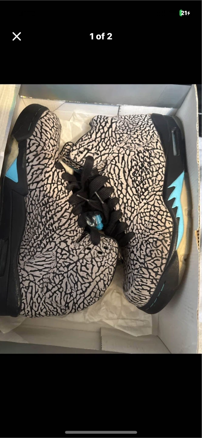 Selling a pair of Jordan 5 Retro lab 5s . These come with the box! The shoes feature a distinctive elephant print design.