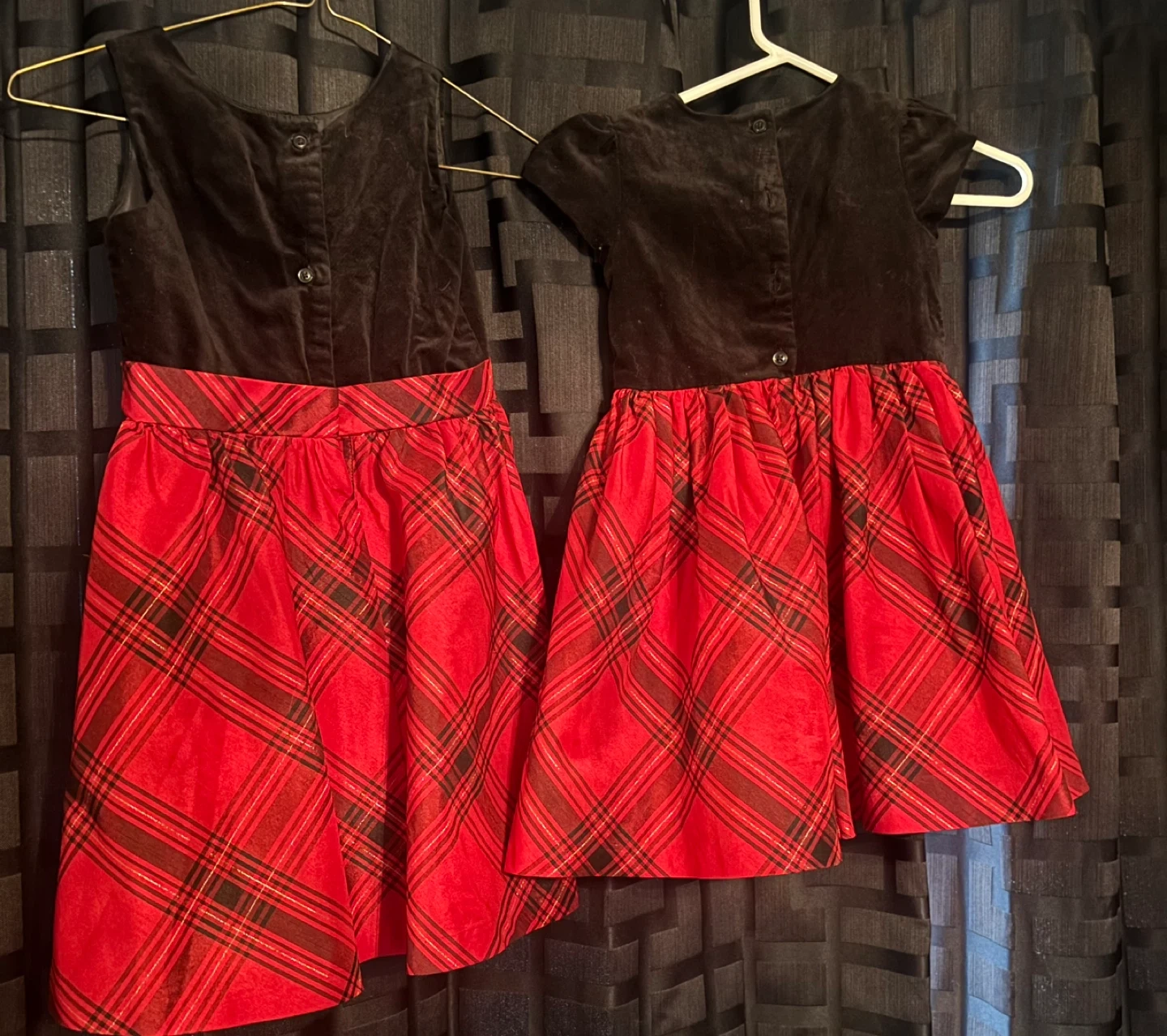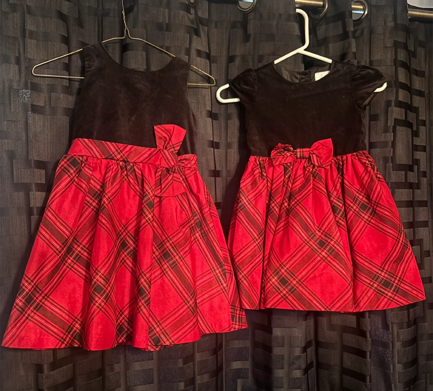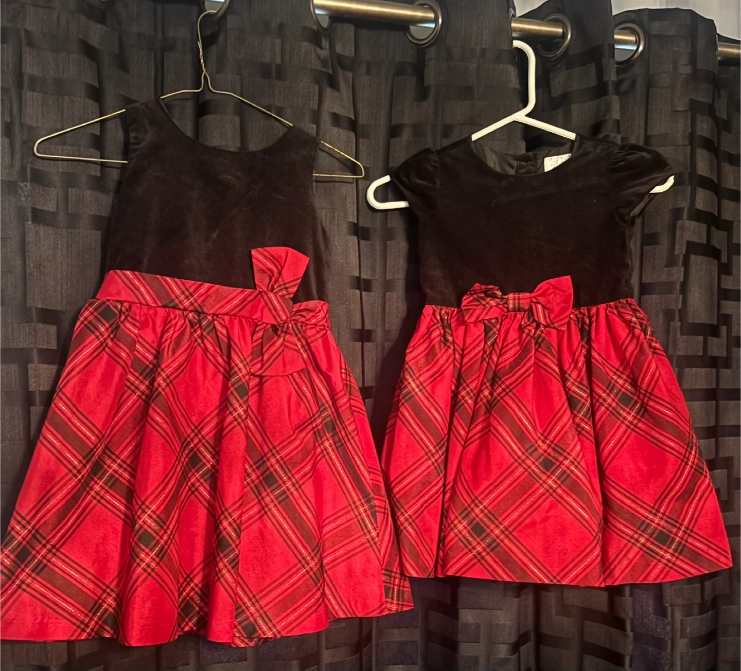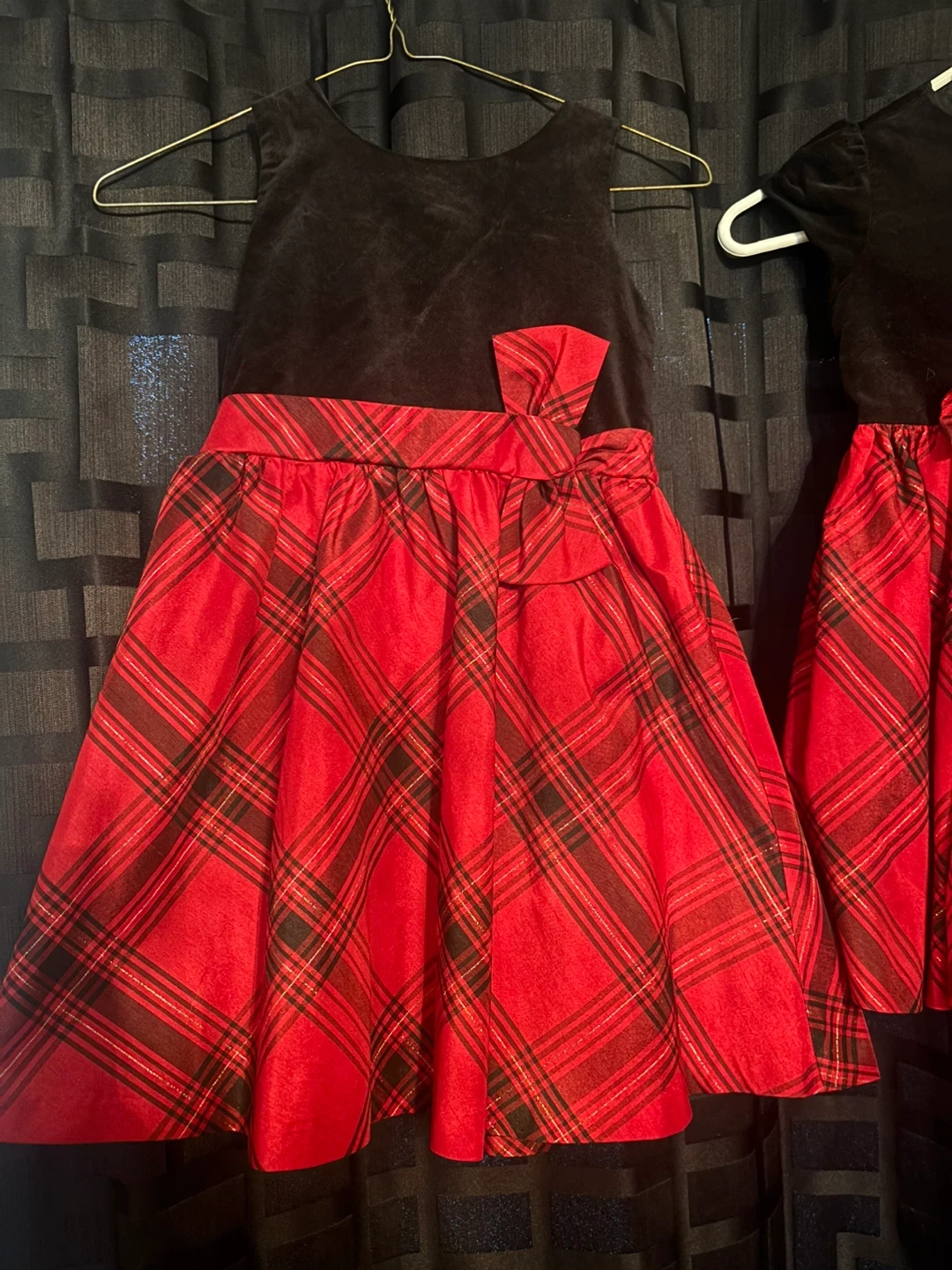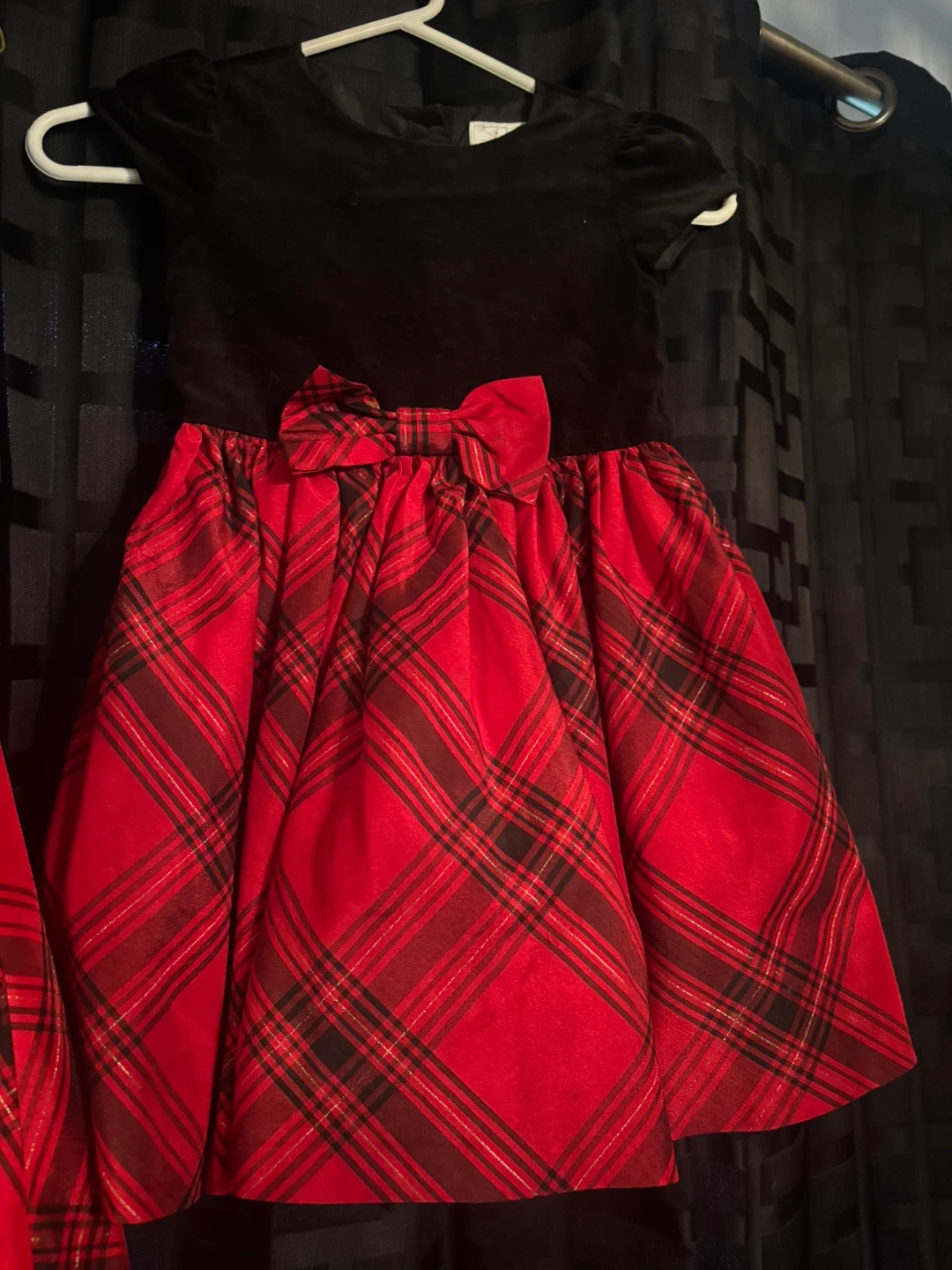 Selling cute girls' dresses perfect for Christmas! It features a black velvet top and a vibrant red plaid skirt. The dress has a bow detail at the waist, adding a touch of elegance for the holidays