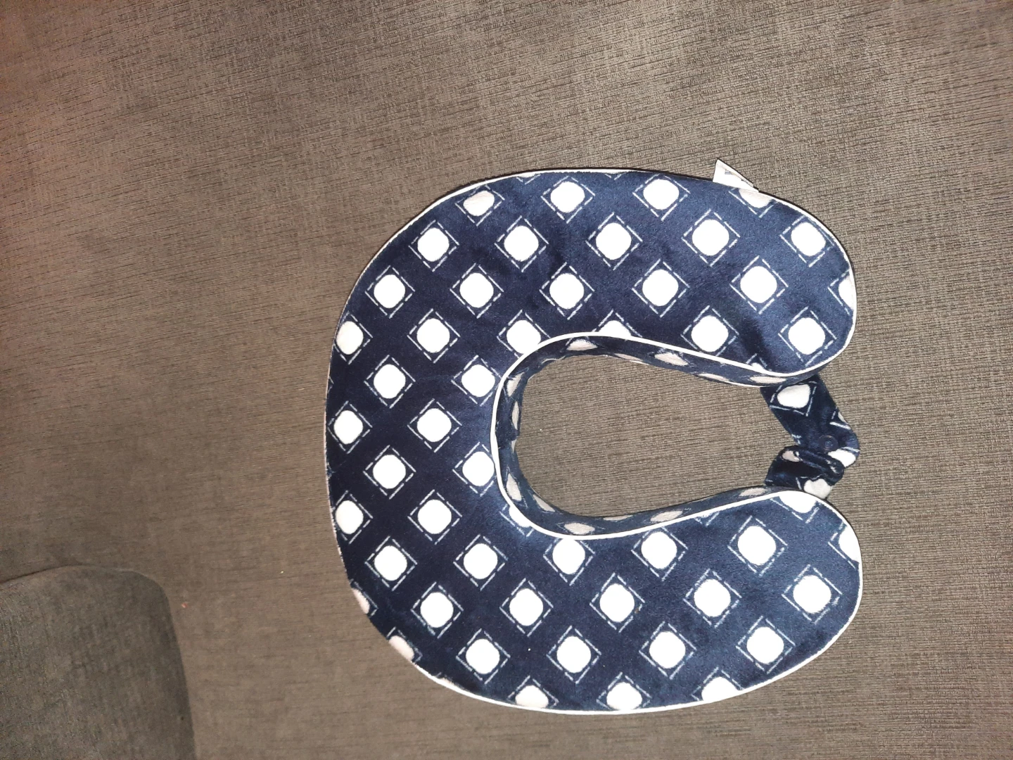 Design: It has a distinctive U-shape designed to provide support for the head and neck, helping to maintain proper alignment while sitting or traveling. The cover features a dark blue or black background with a white, geometric dot pattern and white piping around the edges.
