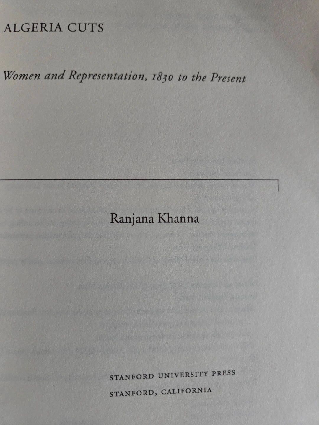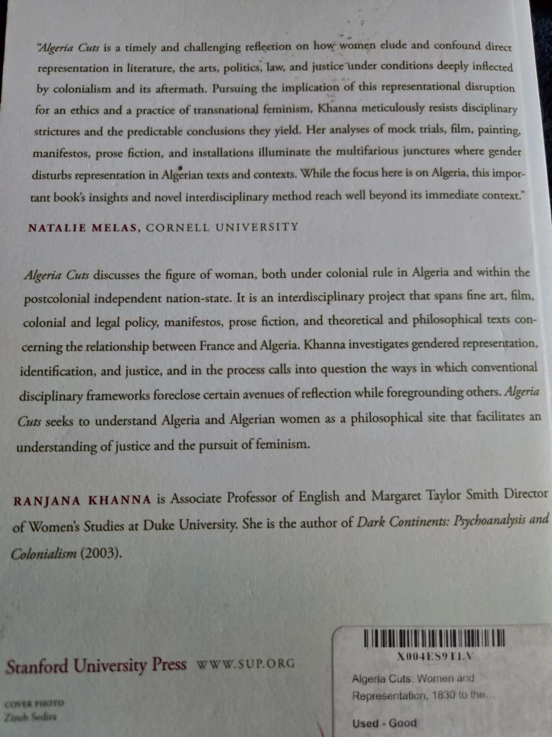 Algeria Cuts discusses the figure of woman, both under colonial rule in Algeria and within the postcolonial independent nation-state. It is an interdisciplinary project that spans fine art, film, colonial and legal policy, manifestos, prose fiction, and theoretical and philosophical texts concerning the relationship between France and Algeria. Khanna investigates gendered representation, identification, and justice, and in the process, calls into question the ways in which conventional disciplinary frameworks foreclose certain avenues of reflection while foregrounding others. Algeria Cuts seeks to understand Algeria and Algerian women as a philosophical site that facilitates an understanding of justice and the pursuit of feminism.