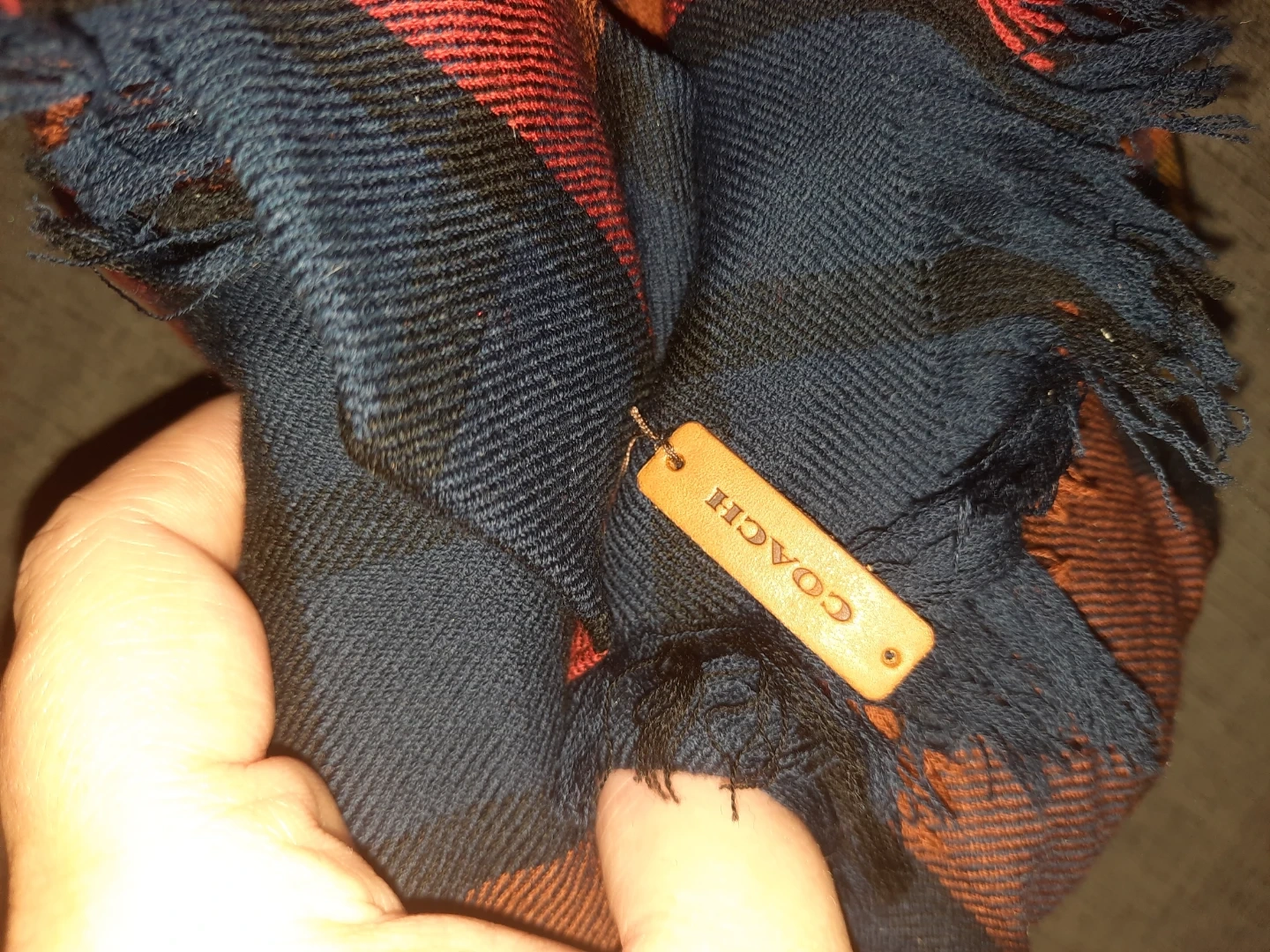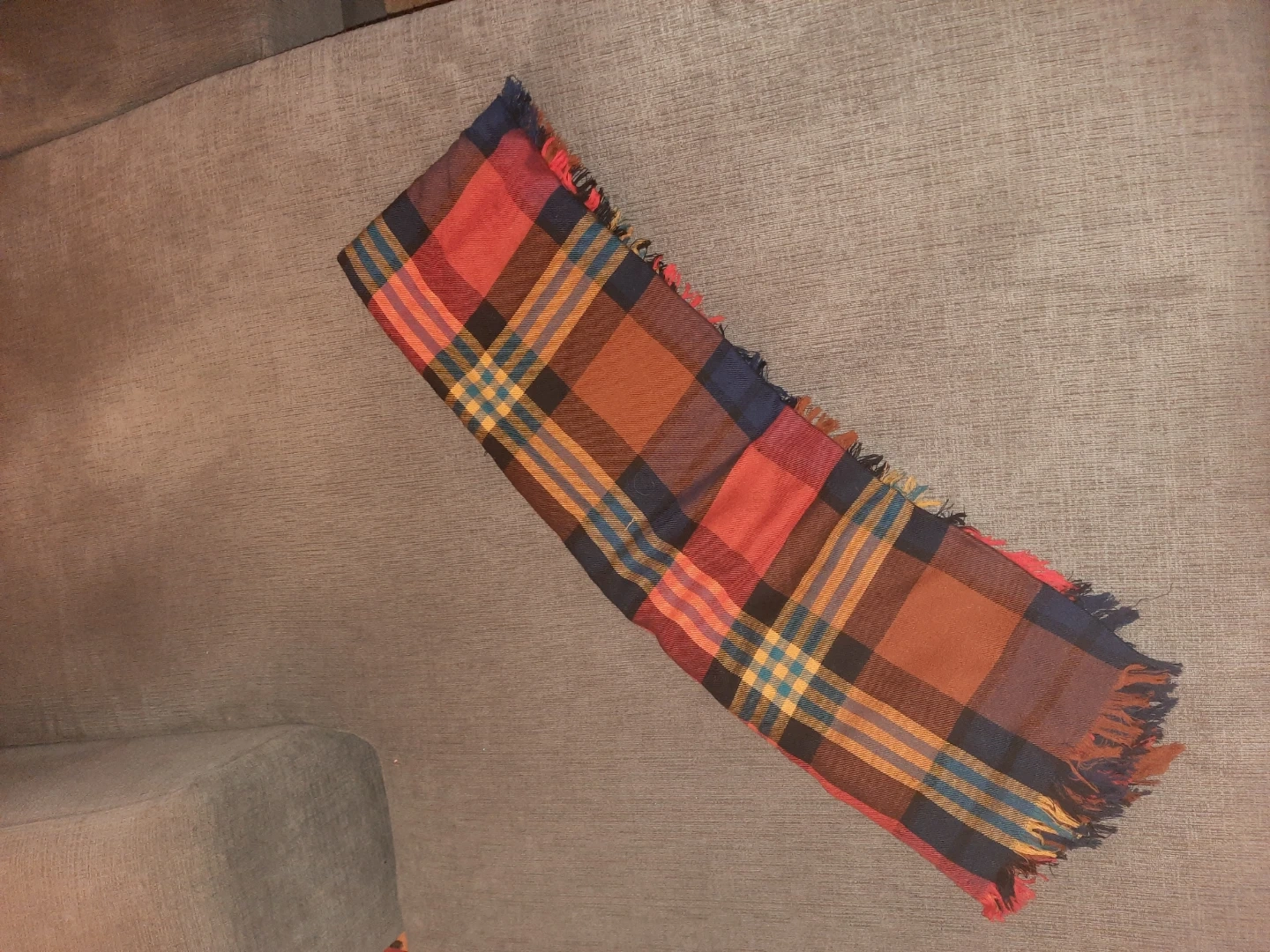 Material and Design: It appears to be a soft, woven fabric, likely wool or a blend, featuring a plaid or striped pattern in dark blue and reddish-orange colors.