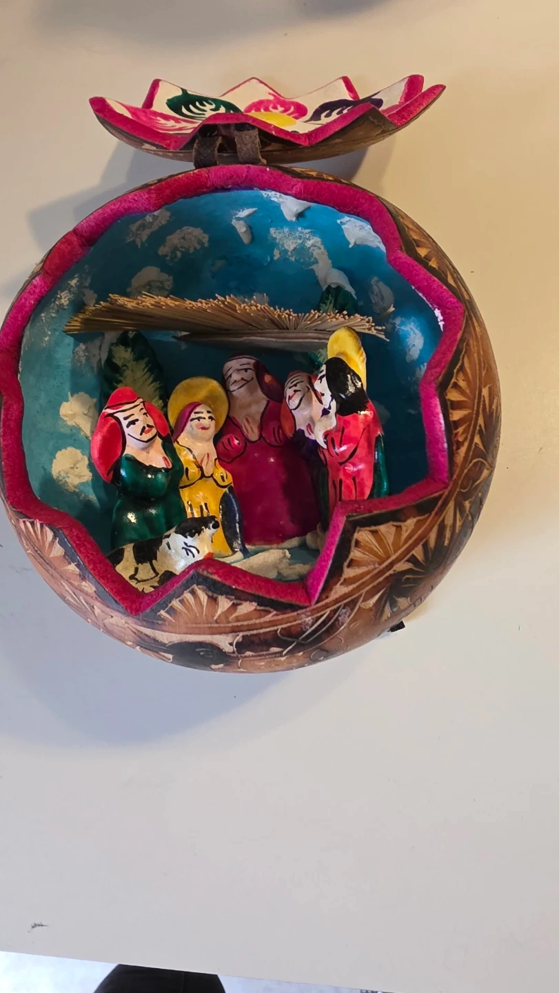 This is a beautiful, handcrafted nativity scene ornament. It features vibrant colors and intricate details. A unique piece to add to your holiday decor!
