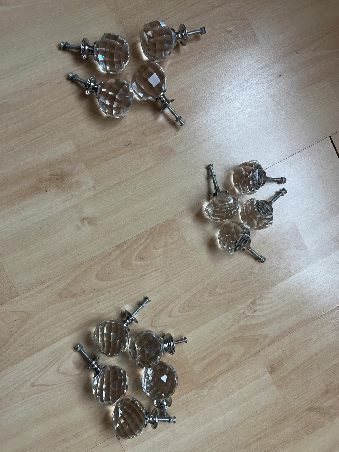 Selling a set of 13 assorted crystal dresser knobs! Ideal for a six-drawer dresser and side table.
