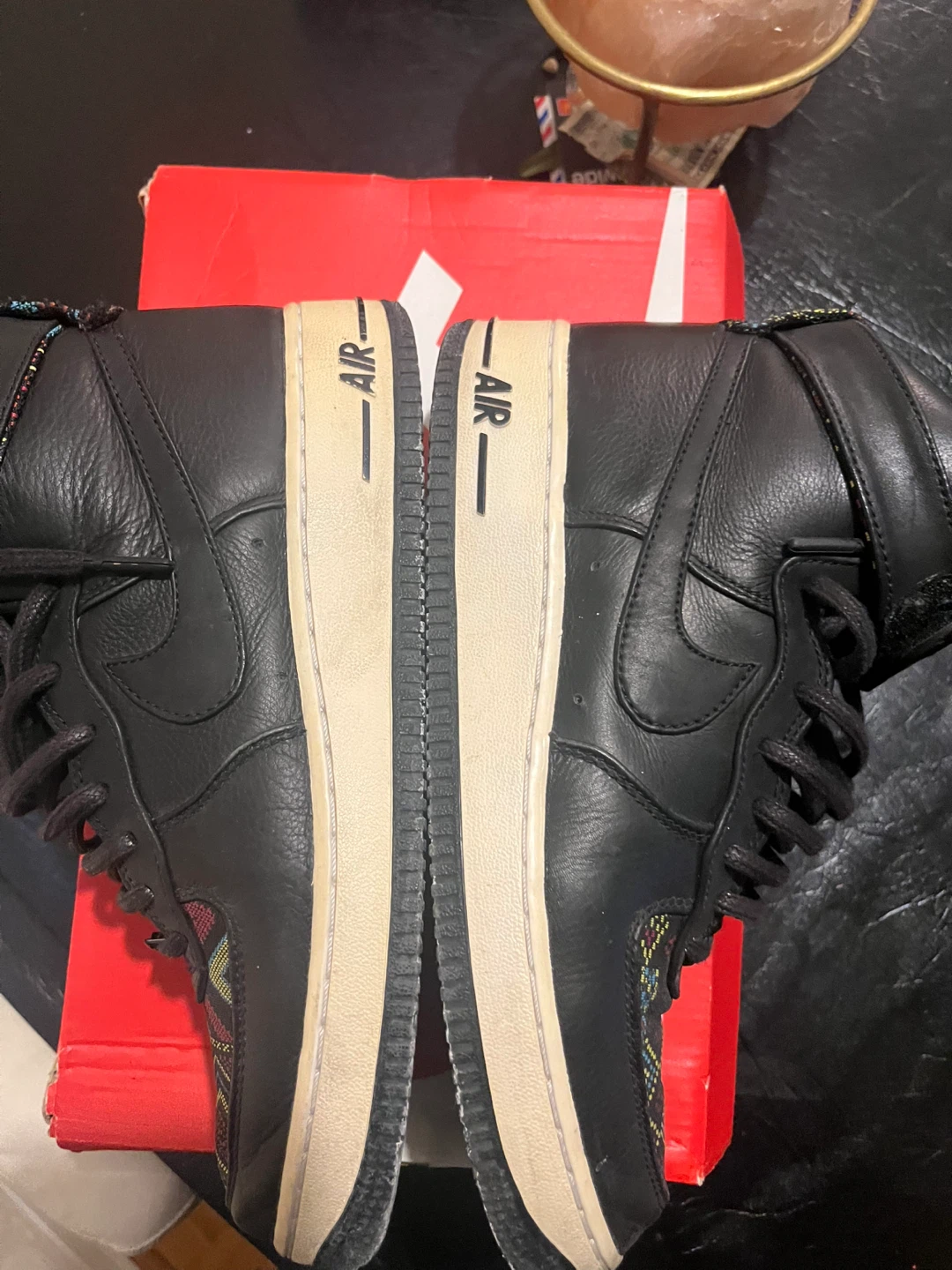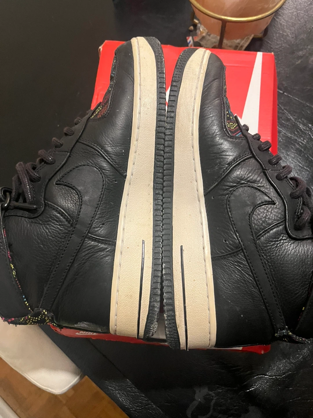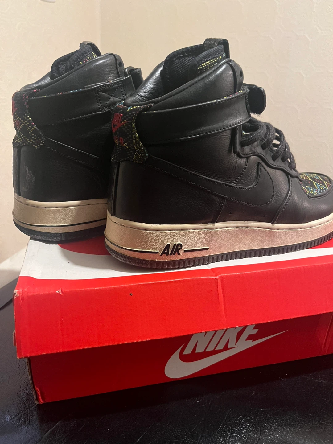 Selling a pair of Nike Air Force 1 High Premium shoes in black. They're in great condition and come with the original box!
