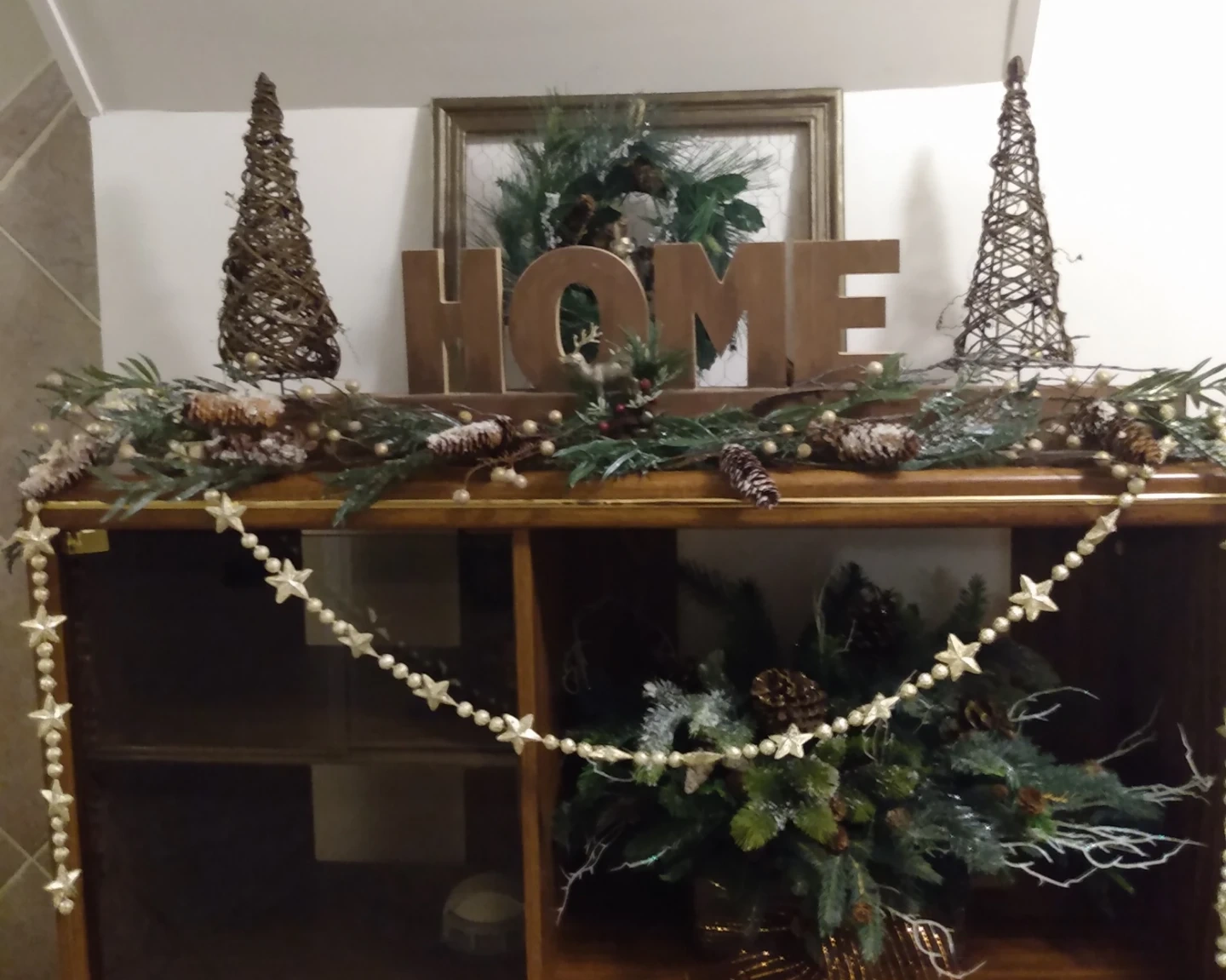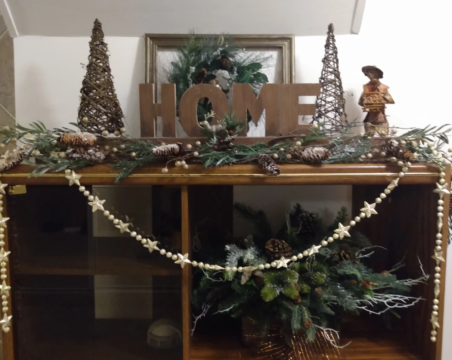 Add a touch of festive sparkle to your home with this lovely Christmas garland! It features star-shaped beads and greenery, perfect for decorating your mantel, doorway, or Christmas tree. (Cash pick up)