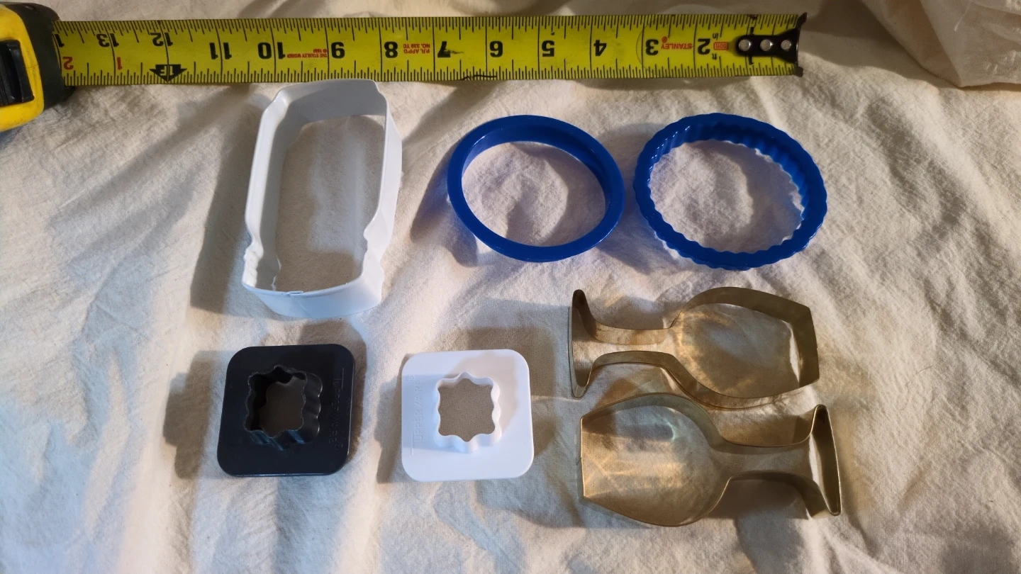 Selling a variety of cookie cutters in different shapes! Two circles, two wine glasses, two Tupperware double-sided stamp cutters and a Mason jar shape. Five bucks for all of them