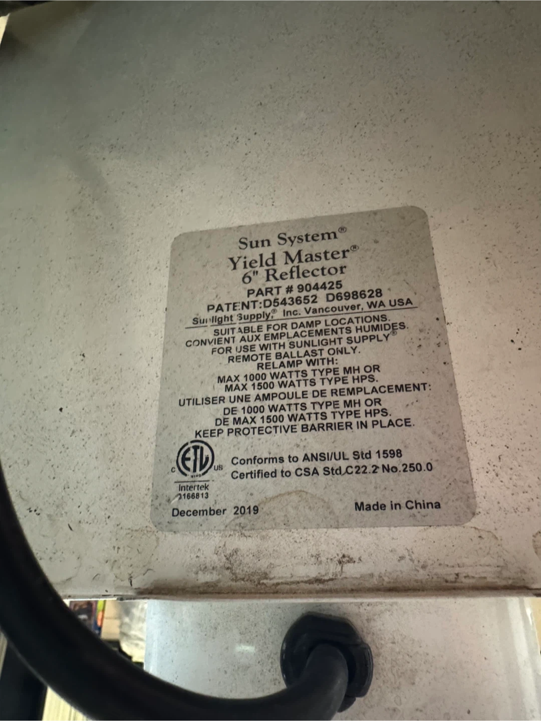 Selling a Sun System Yield Master 6" Reflector. It's suitable for damp locations and convenient aux emplacements humides. It is for use with sunlight supply remote ballast only. It can relay with max 1000 watts type MH or max 1500 watts type HPS.