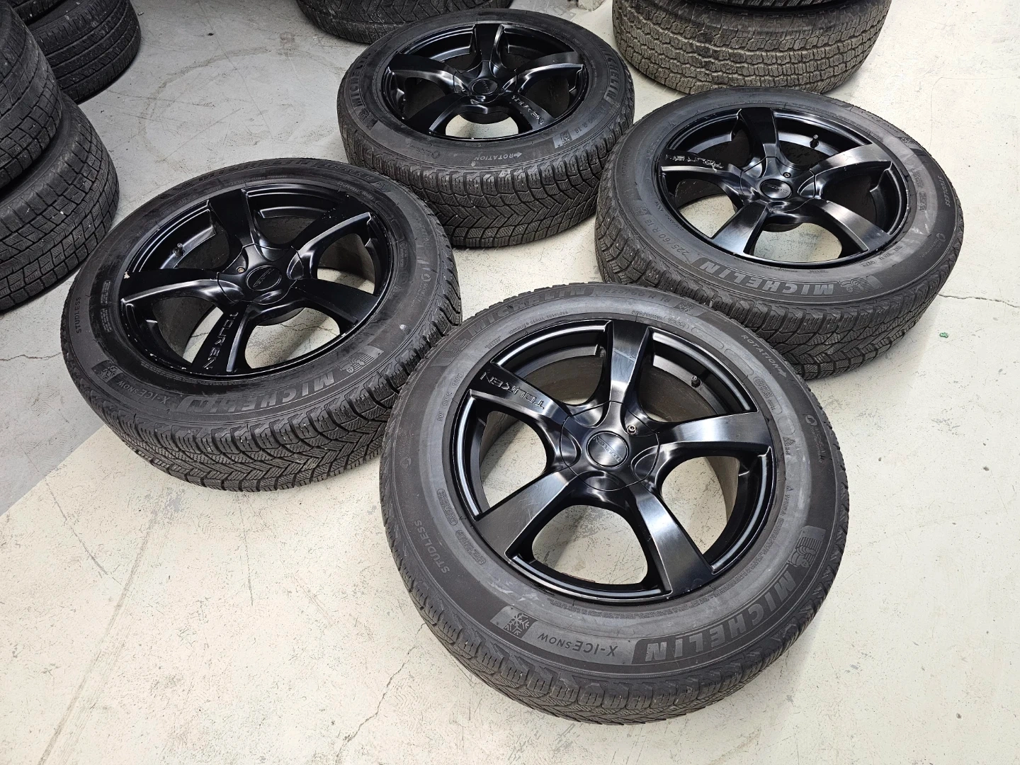 Set of 4 18" Michellin X-ICE winter tires on touren rims 225/60/R18. Rims and tires are in good shape, no bend, no cracks, no damage. Lots of thread left on tires, no patch, no leaks. Rims are multi-fit with bolt pattern 5×120 and 5×112