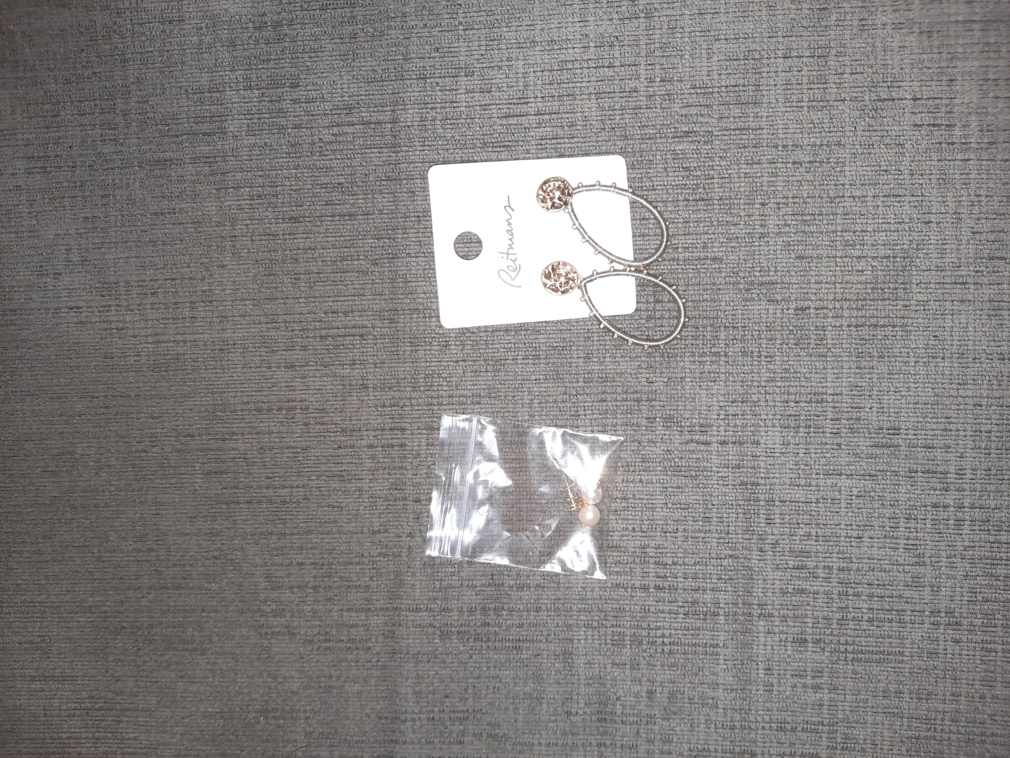 Object Description: The earrings appear to be a drop or hoop style made of a silver-toned metal. They feature a round, textured stud at the top and an open, teardrop-shaped loop hanging below with small bead-like details along the edge. $ 8.00