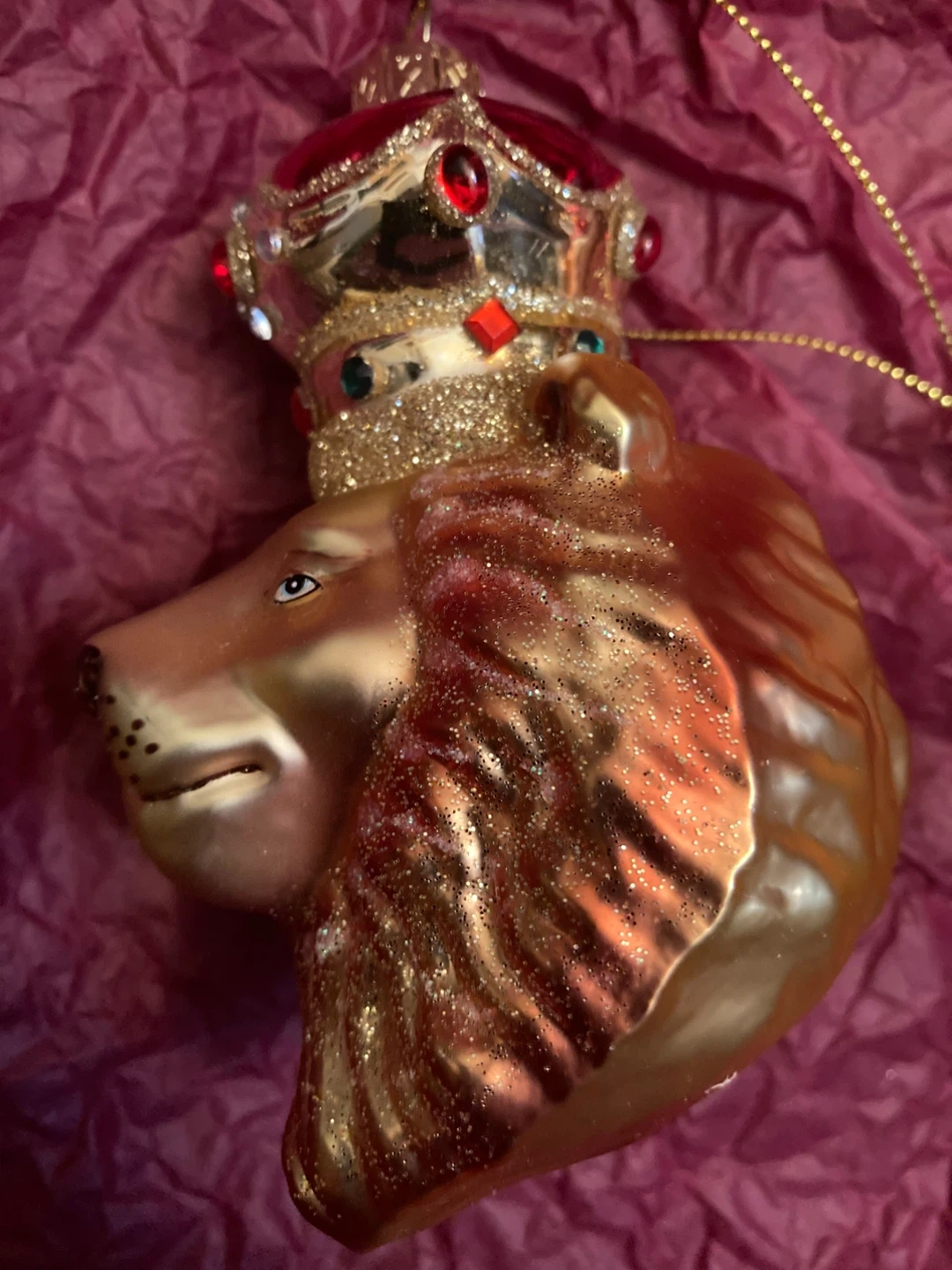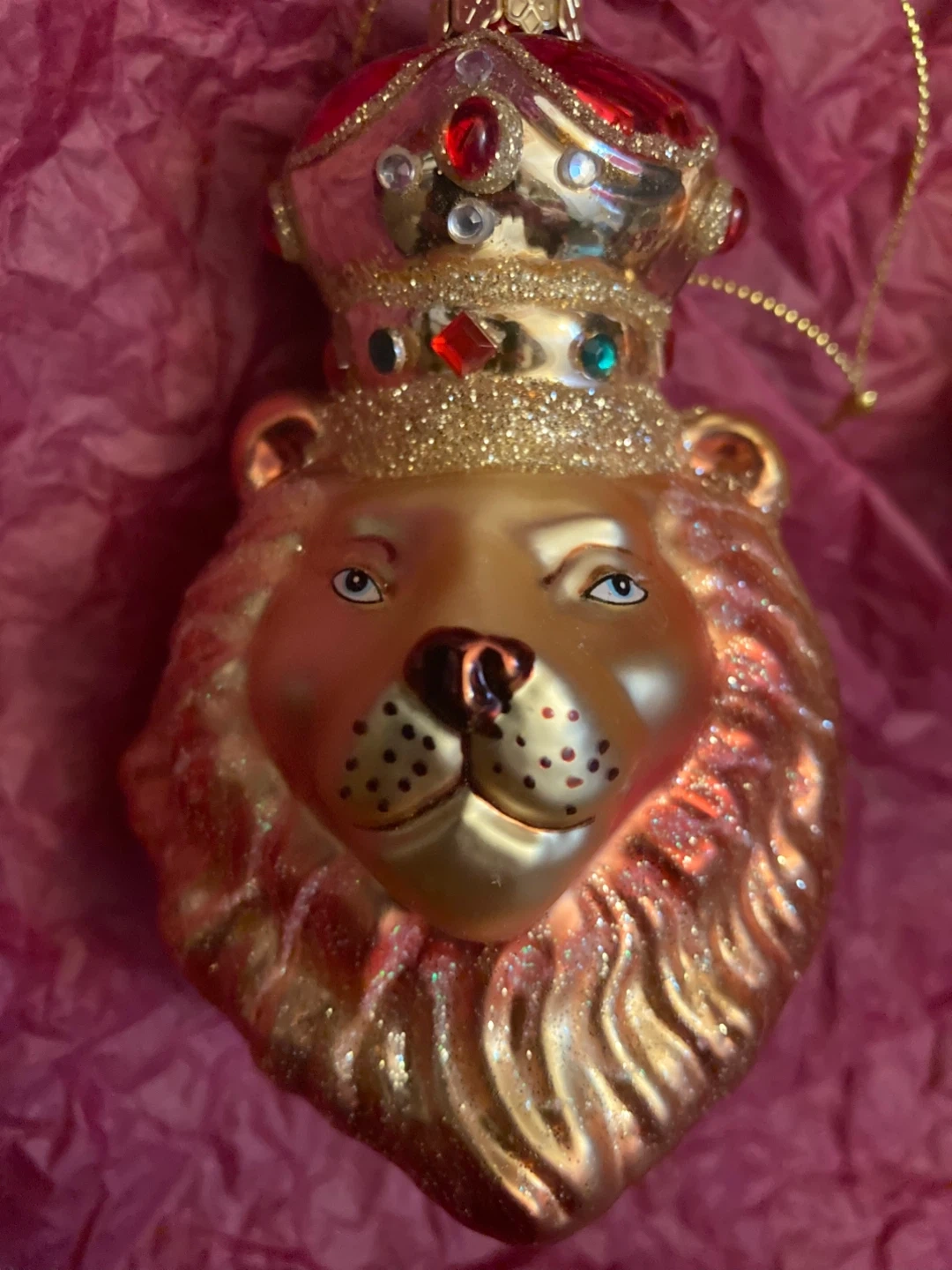Unique lion head Christmas ornament! It features a regal crown adorned with colorful gems. Perfect for adding a touch of royalty to your holiday decor. 4 inches. Blown glass