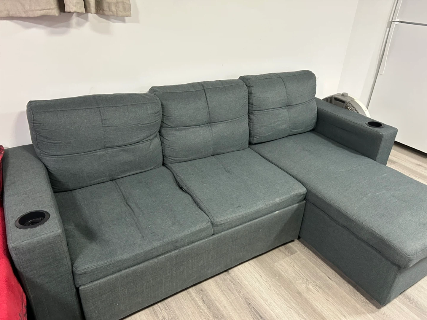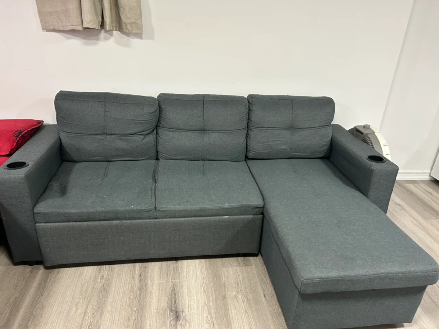 Selling a comfy grey sofa! It features a convenient pull-out bed, perfect for guests or small spaces. It's in great shape and ready for a new home. Has a cupholder on each armrest!