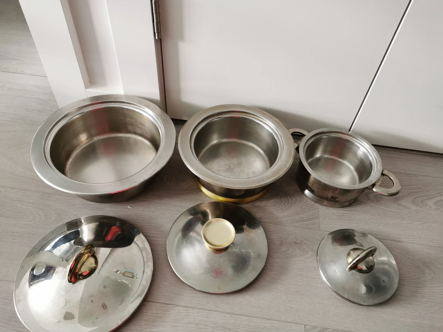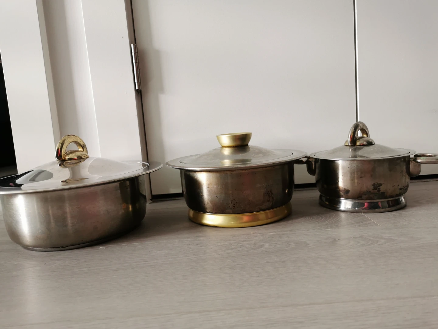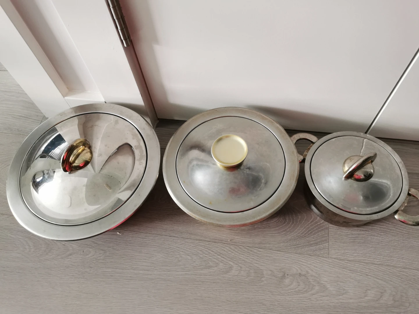 Selling a set of three vintage stainless steel pots/serving pots with lids. They have a classic design and are in good condition for their age. Perfect for adding a retro touch to your kitchen!