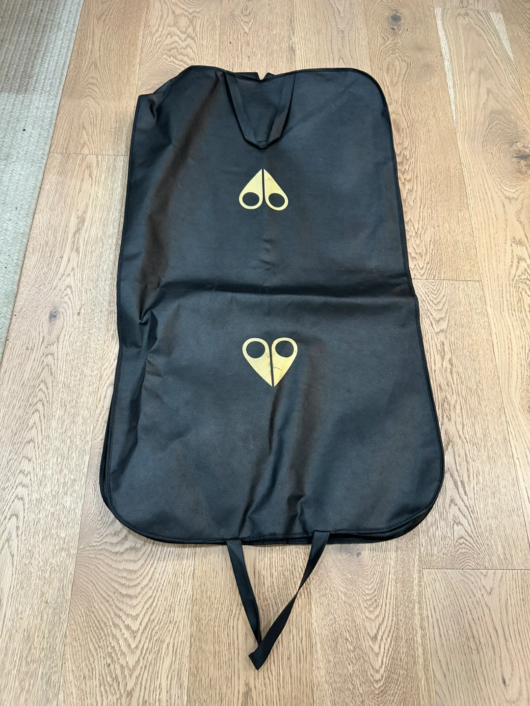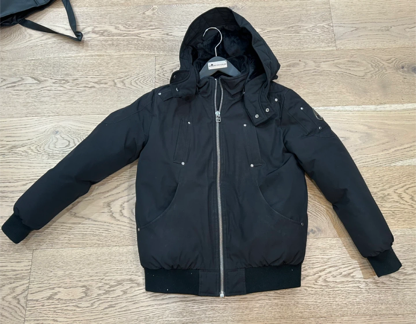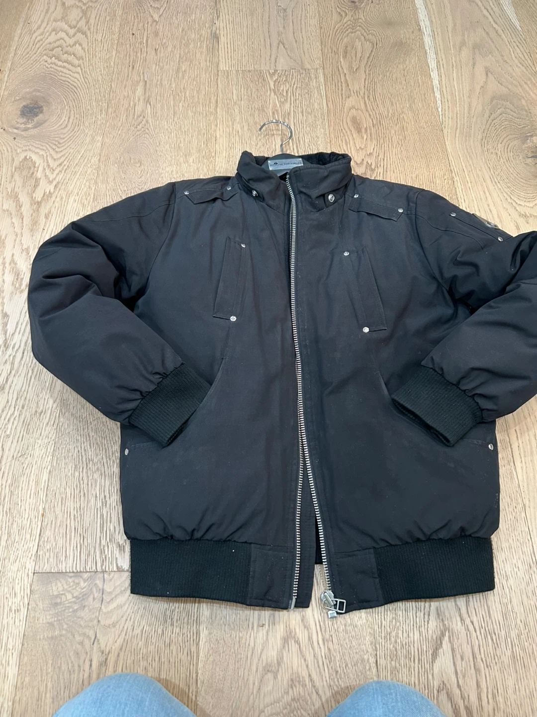 Moose Knuckles bomber jacket in black. It's in great condition and comes with its original garment bag and wooden hangar.