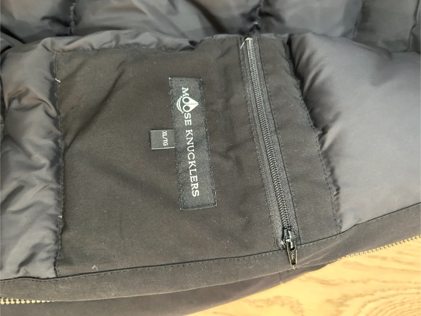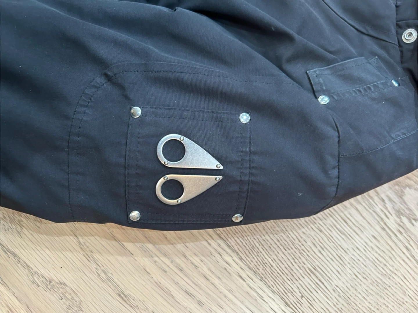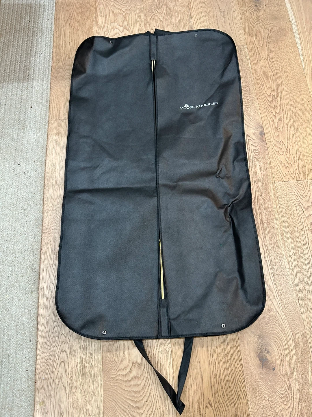 Moose Knuckles bomber jacket in black. It's in great condition and comes with its original garment bag and wooden hangar.