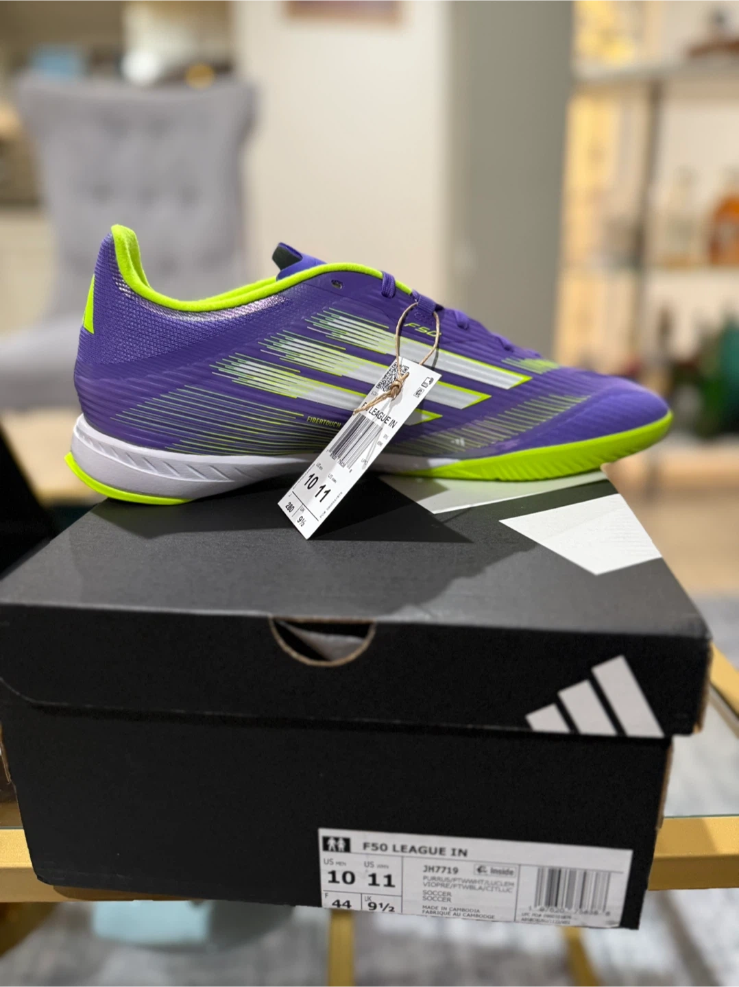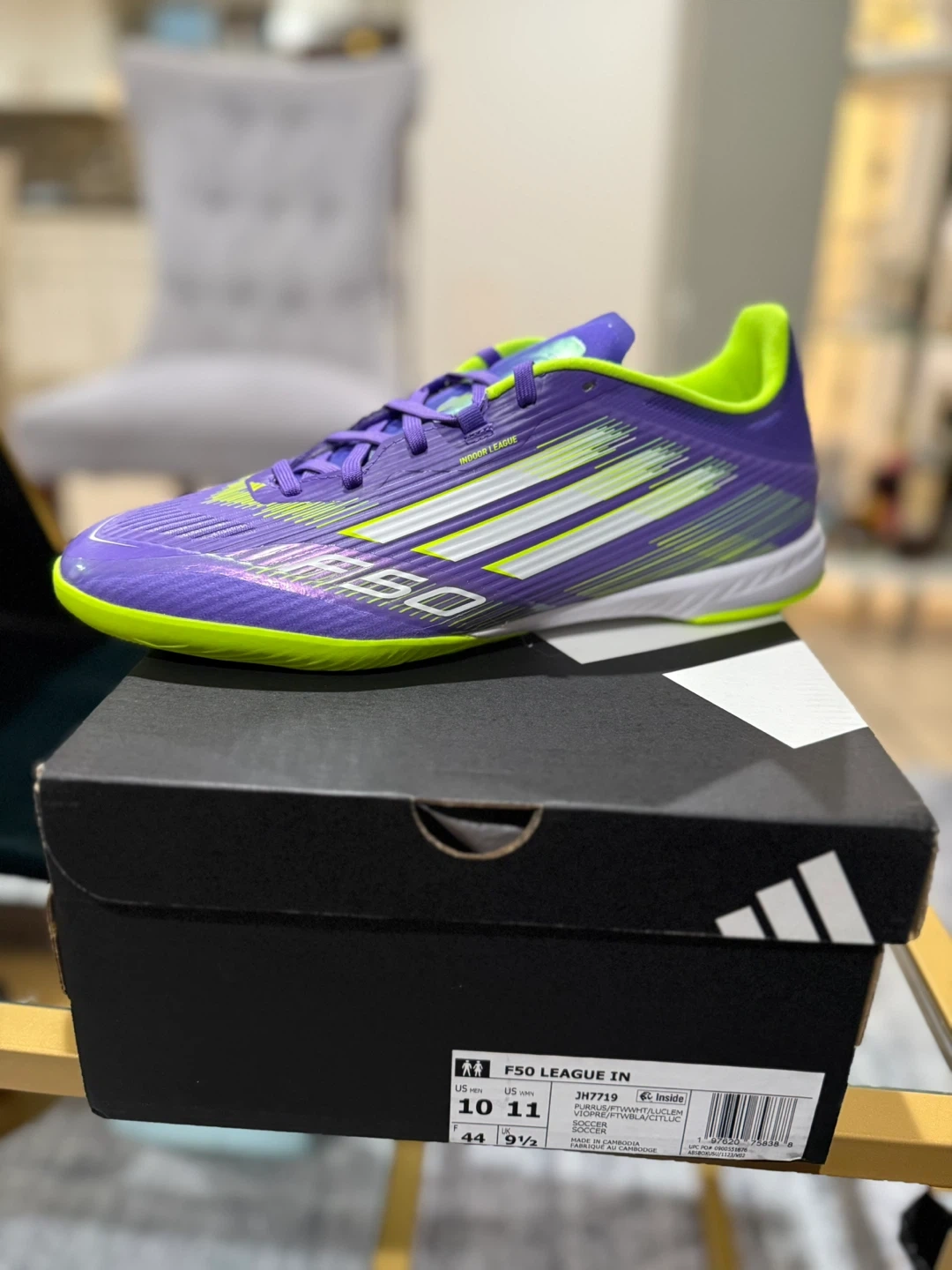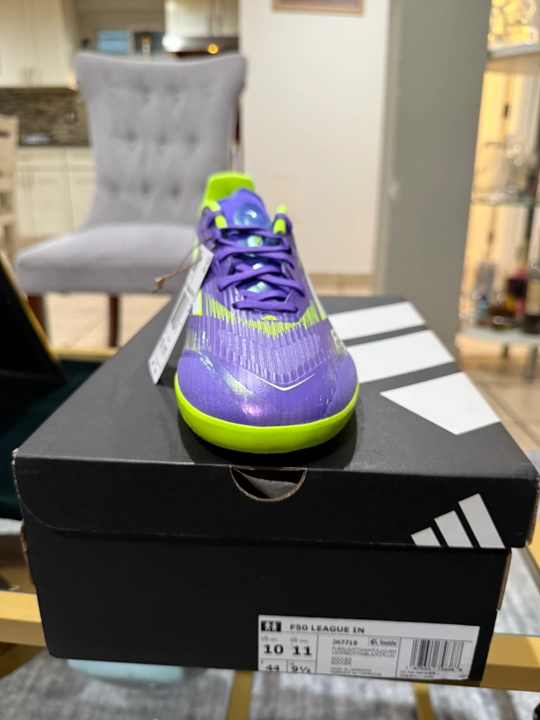These Adidas F50 League IN indoor soccer shoes are a vibrant purple and green. They're a US size 10 The box is included!
