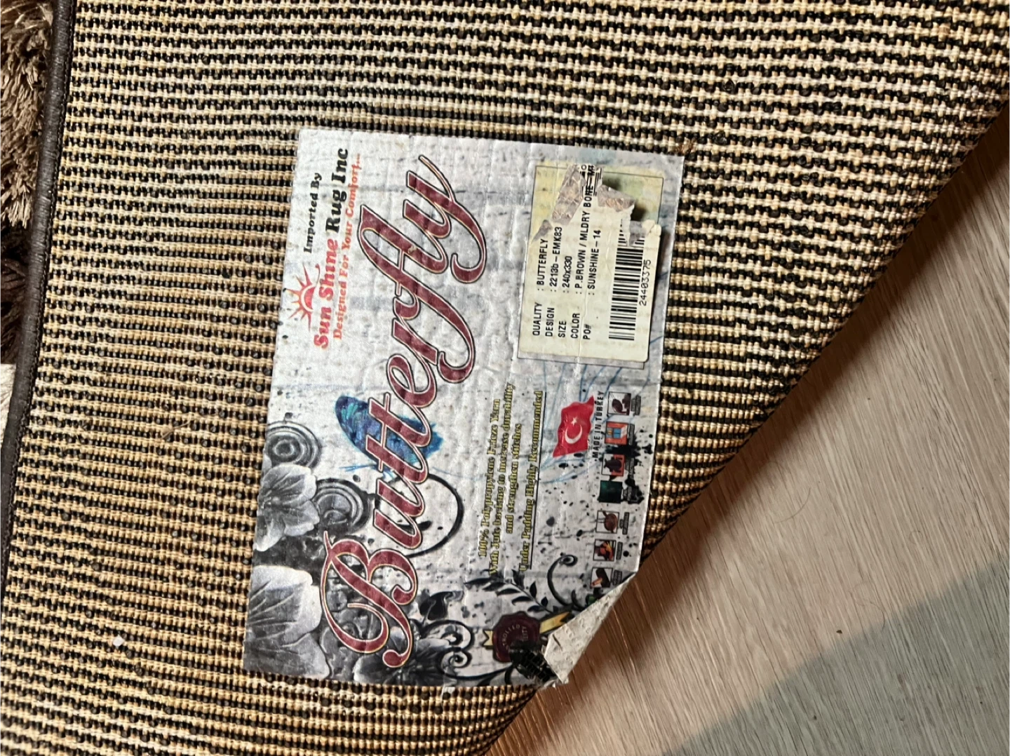 Selling a Butterfly rug in brown from Sunshine Rug Inc. It's a lovely rug with a unique design that would look great in any room. The size is 14. It's in good condition and ready for a new home!