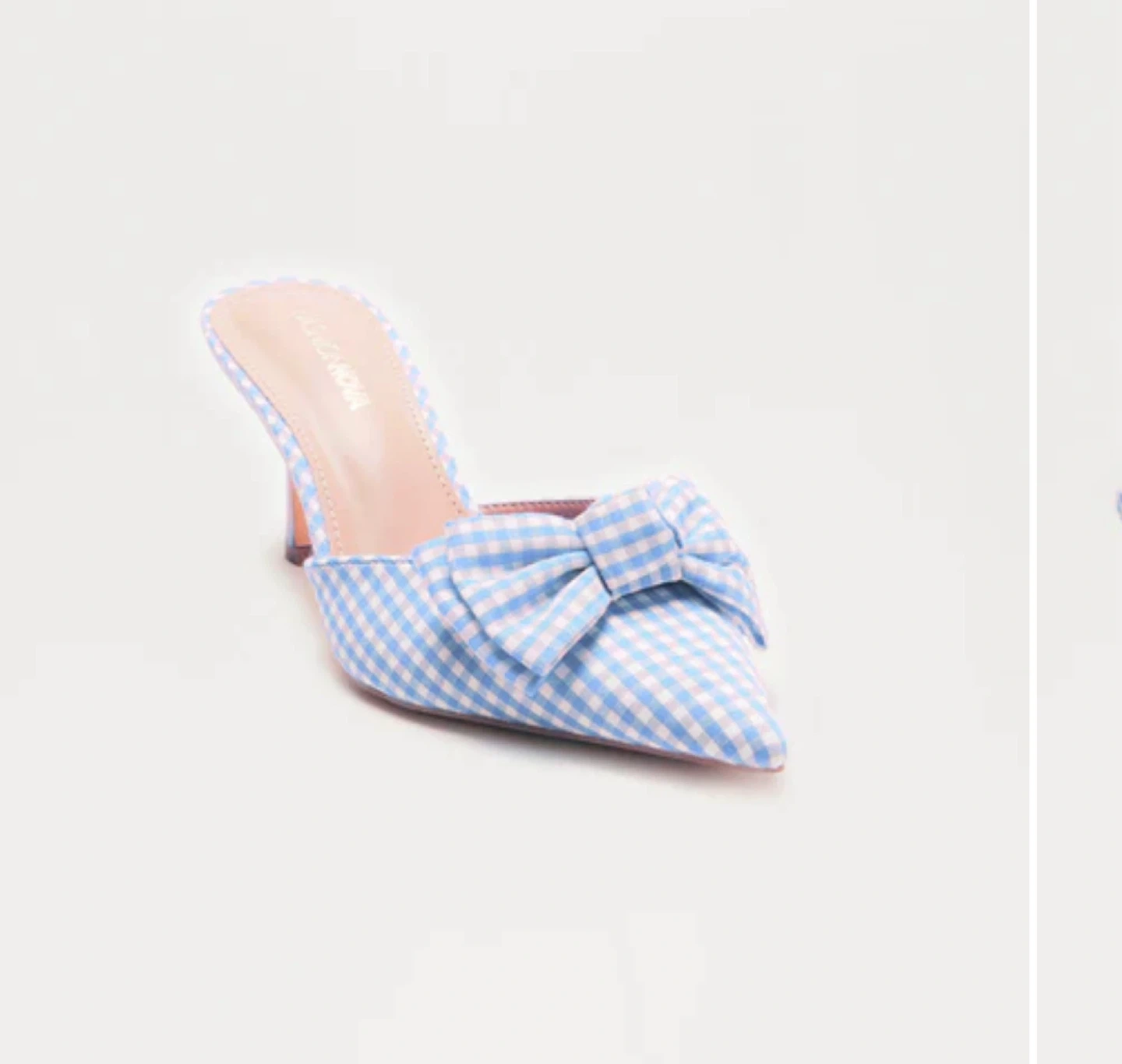 I'm selling a pair of women's heels. One pair is blue and white checkered with a bow. The other pair is black with a strap and a gold embellishment