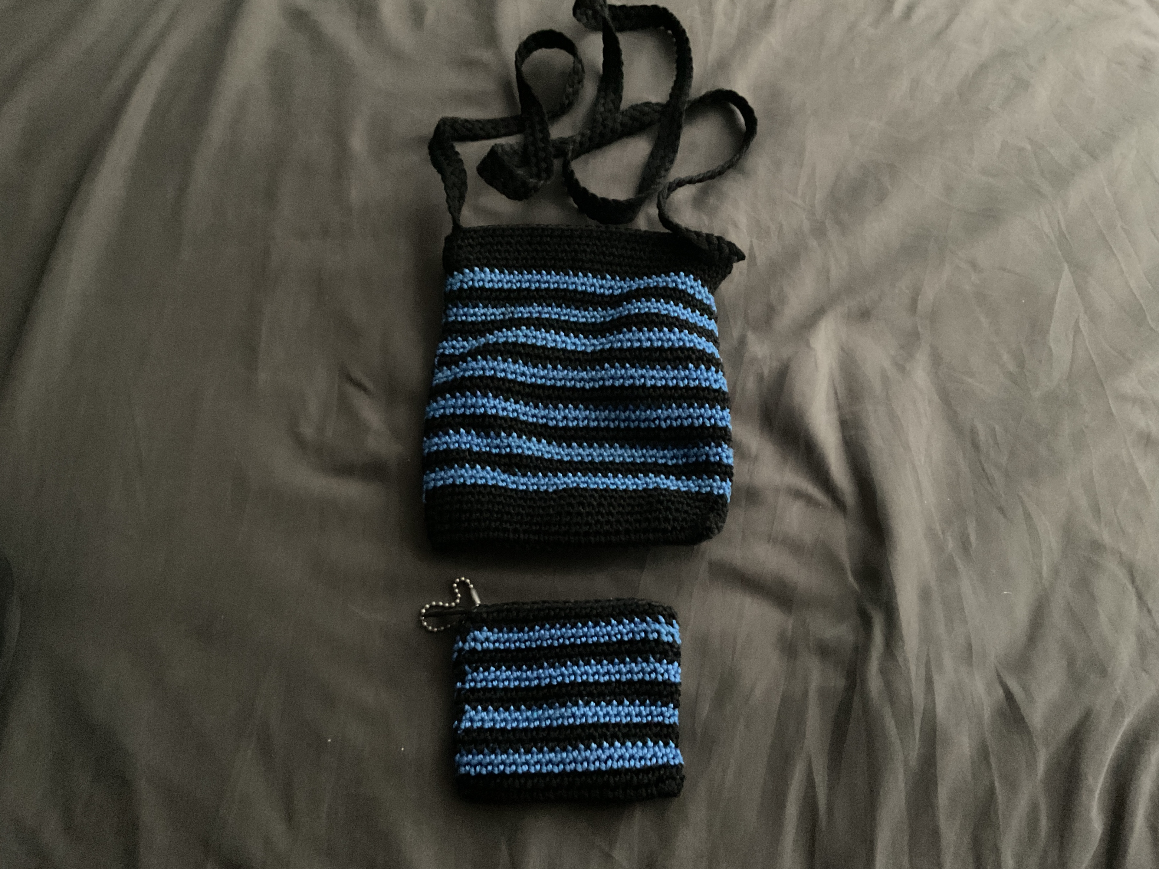 Selling a cute handmade crocheted bag and matching wallet set! The bag features a black and blue striped pattern with a woven strap. The wallet has a similar design. Perfect for adding a unique touch to your style!