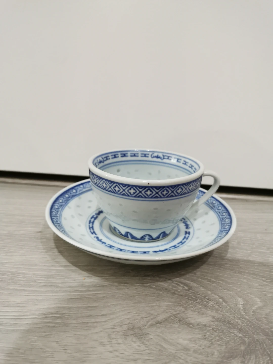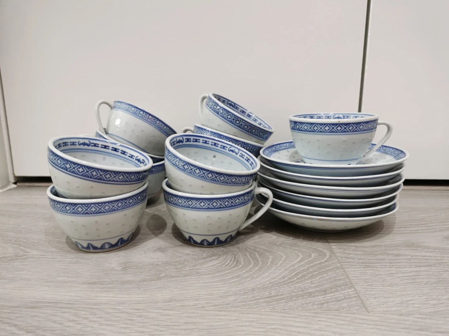 Selling a set of vintage rice pattern tea cups and saucers. They feature a delicate blue and white design. Perfect for adding a touch of elegance to your tea time! 11 cups and 6 saucers.