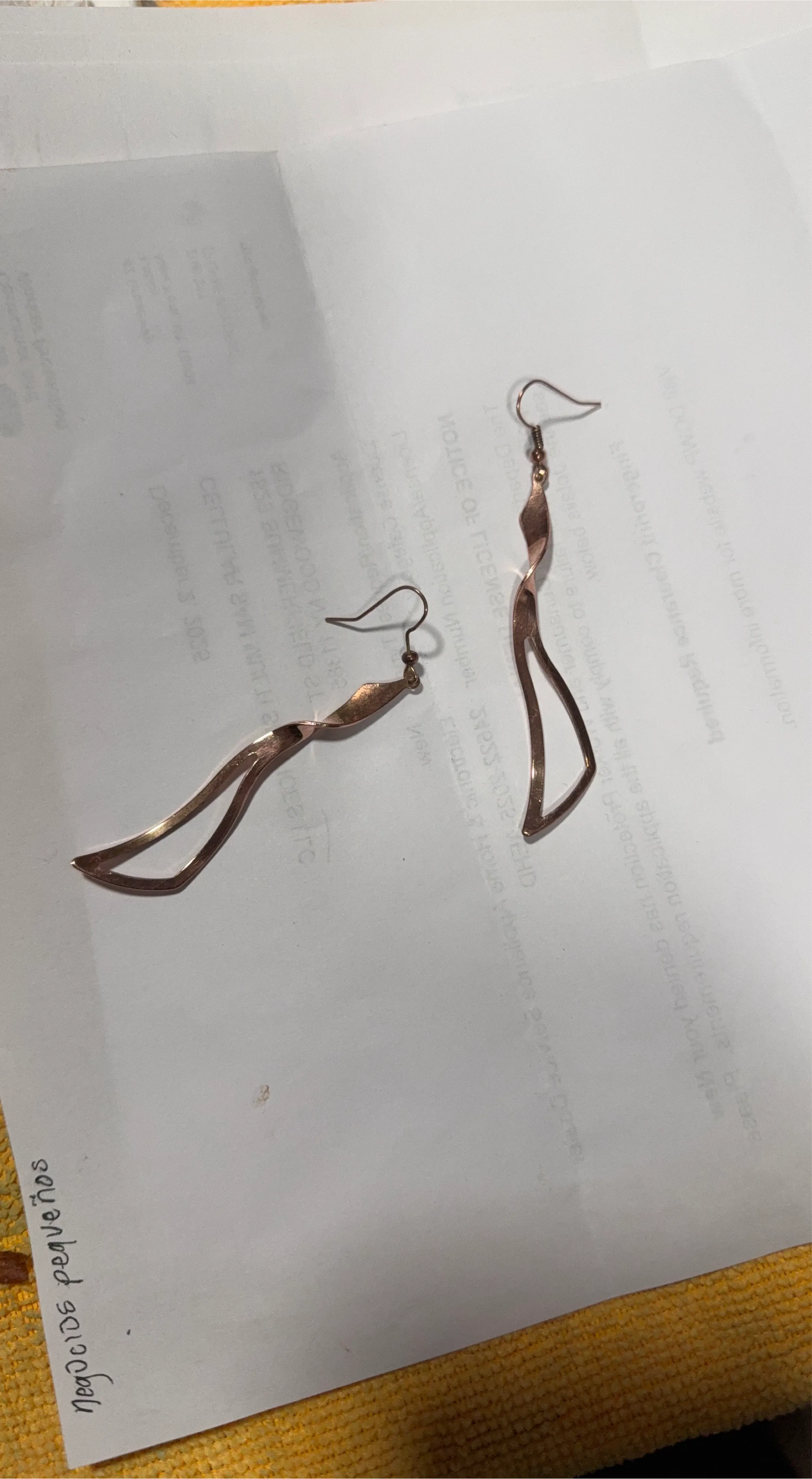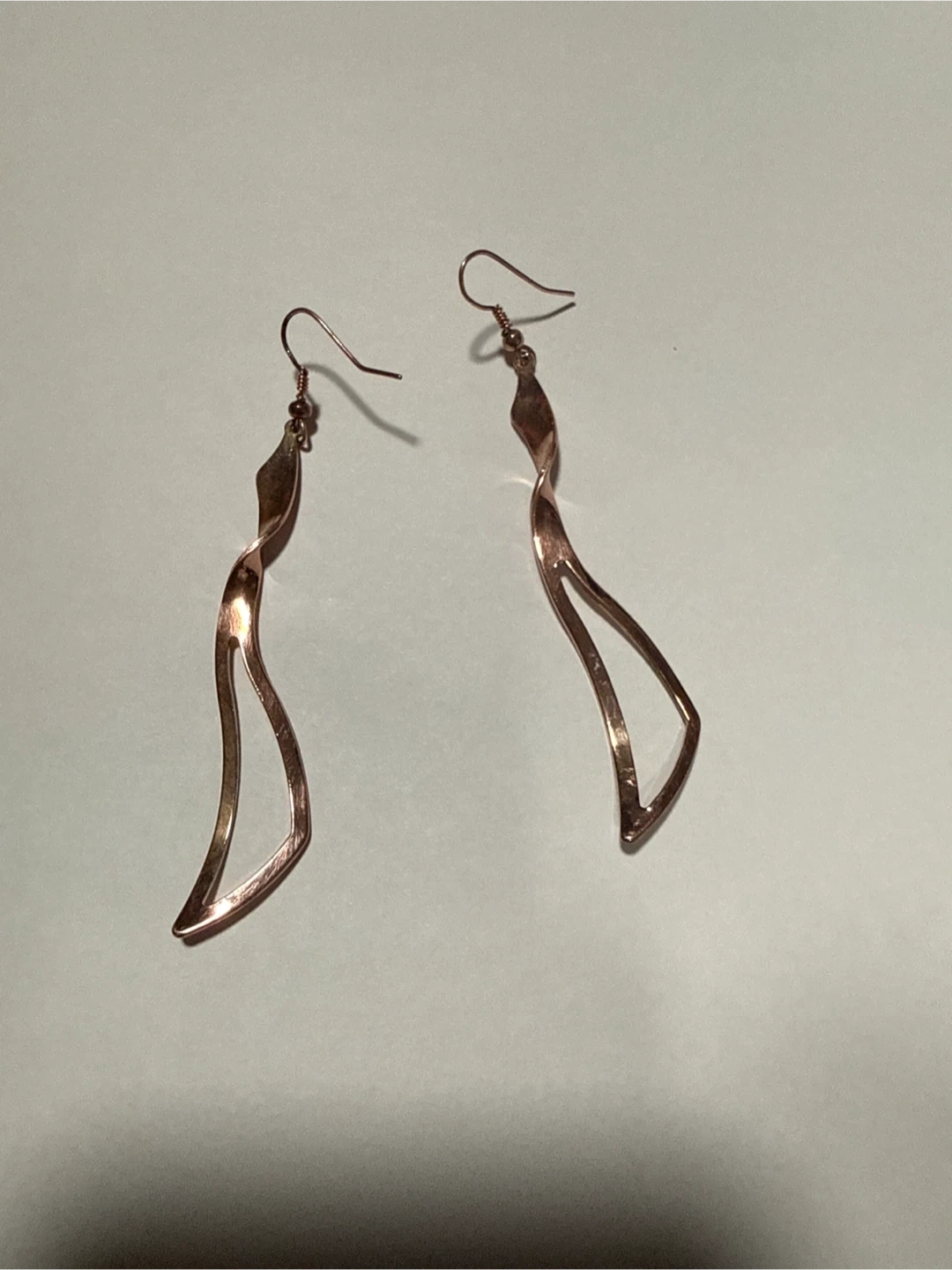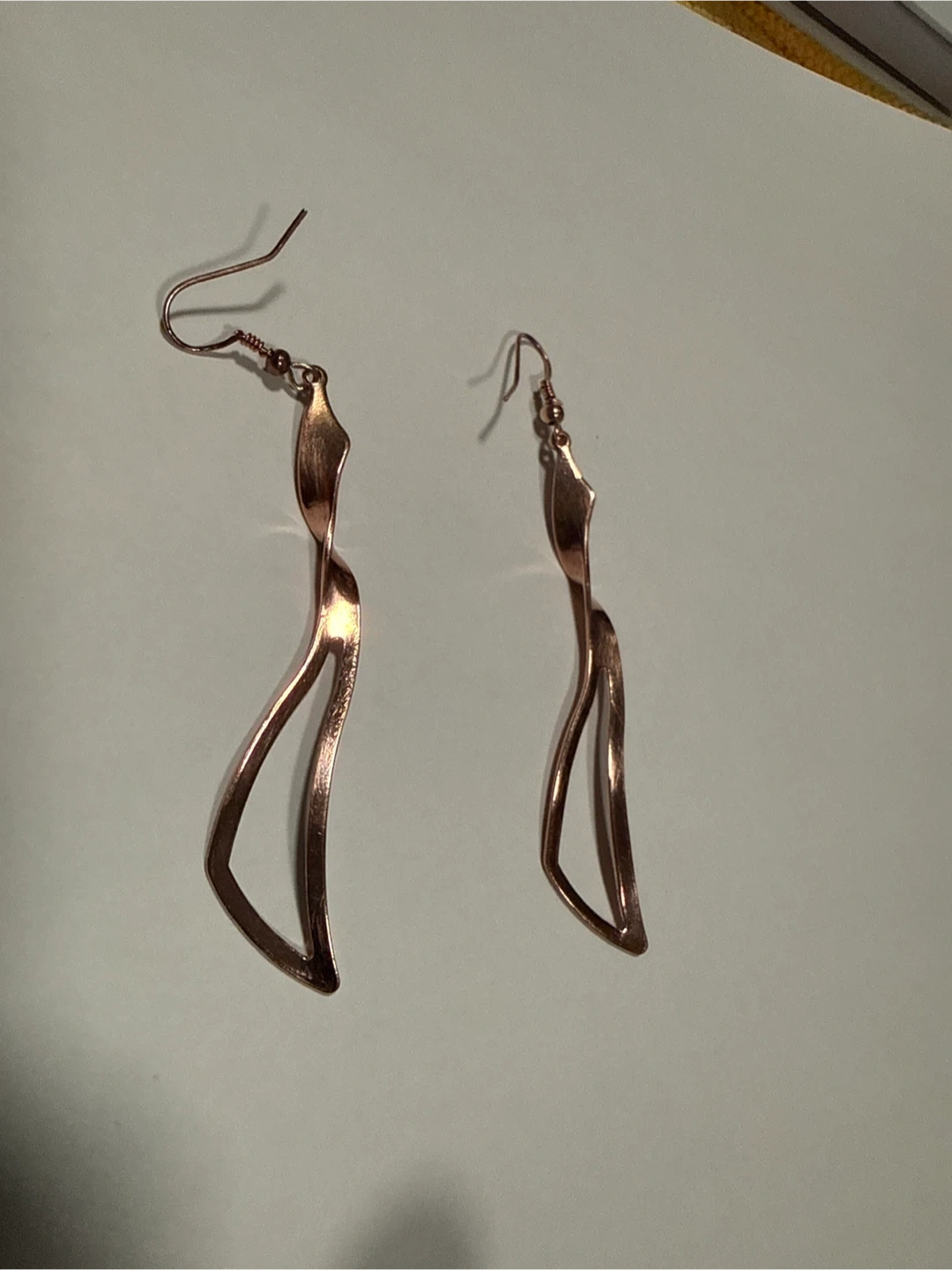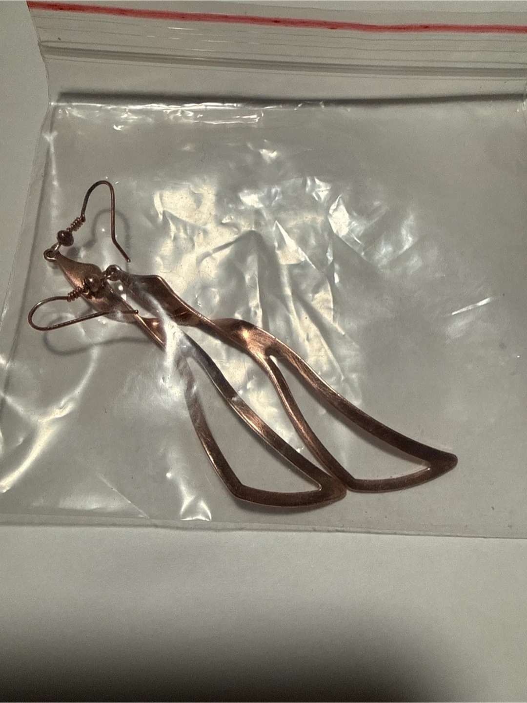 These are a pair of copper-colored dangle earrings. They feature a unique design. Perfect for adding a touch of elegance to any outfit!