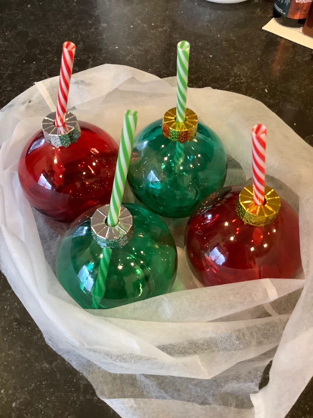 Selling a set of adorable red and green Christmas ornament drink tumblers! These are perfect for adding a festive touch to your holiday gatherings. They are in great condition and ready to bring some cheer to your home