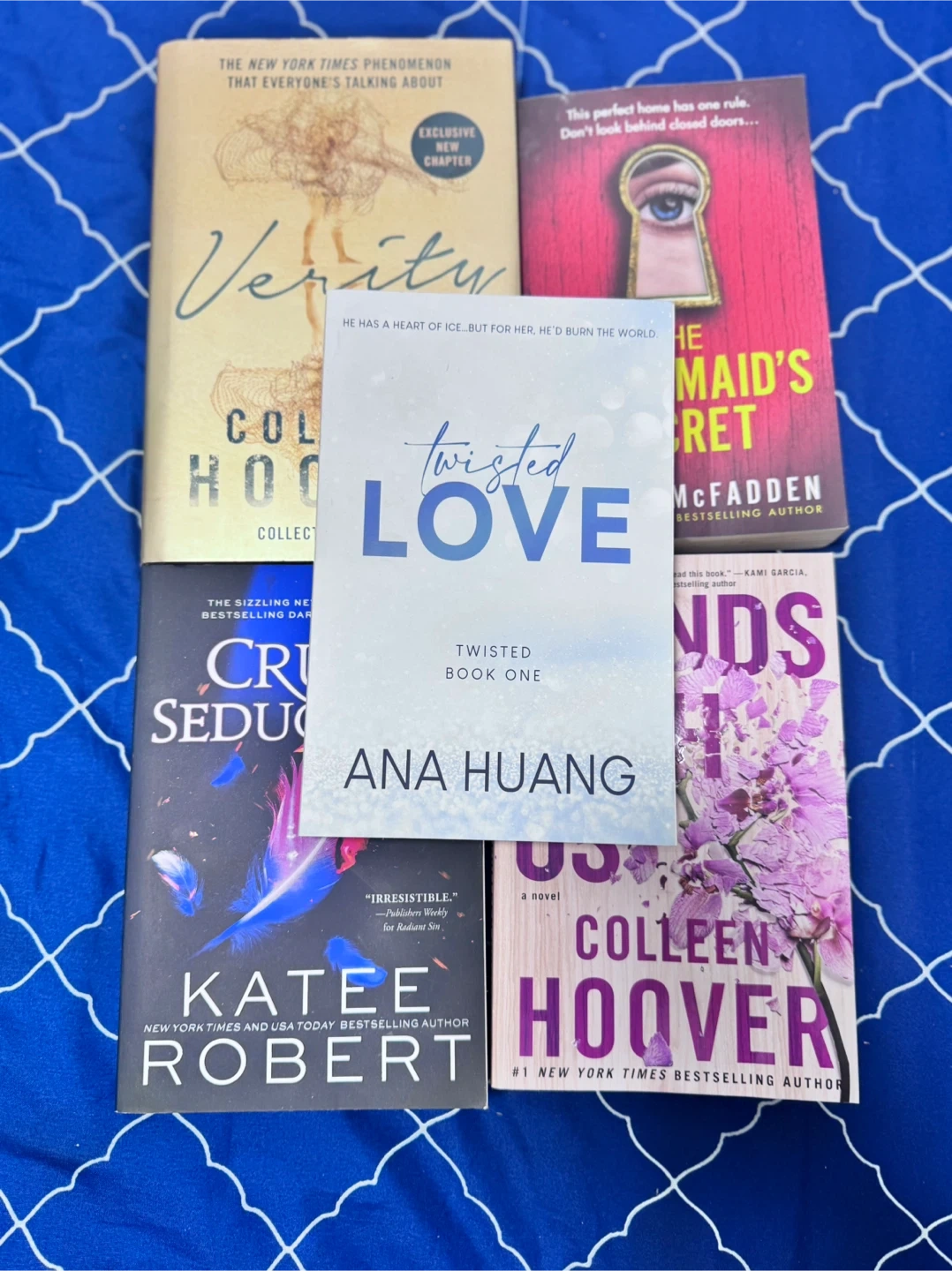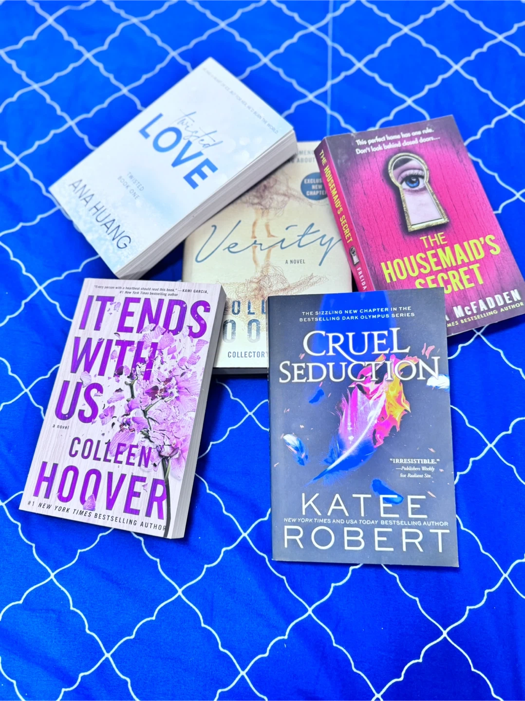 Selling a collection of paperback books! Titles include Verity by Colleen Hoover, Twisted Love by Ana Huang, The Housemaid's Secret by McFadden, Cruel Seduction by Katee Robert, and It Ends With Us by Colleen Hoover. Great for anyone looking for a new read!