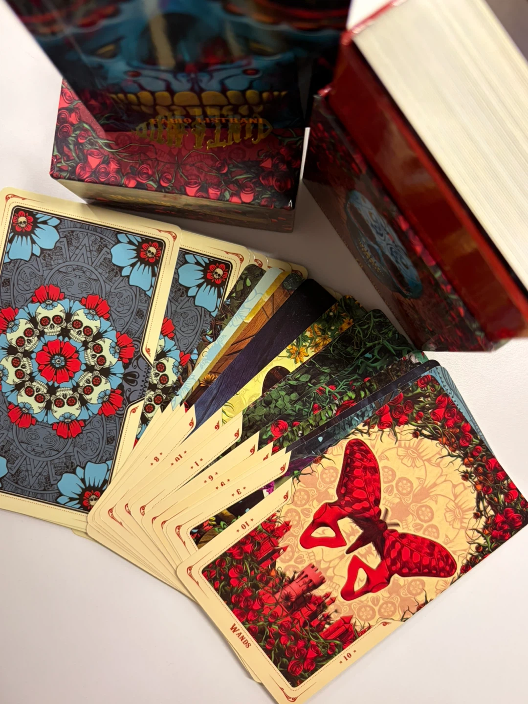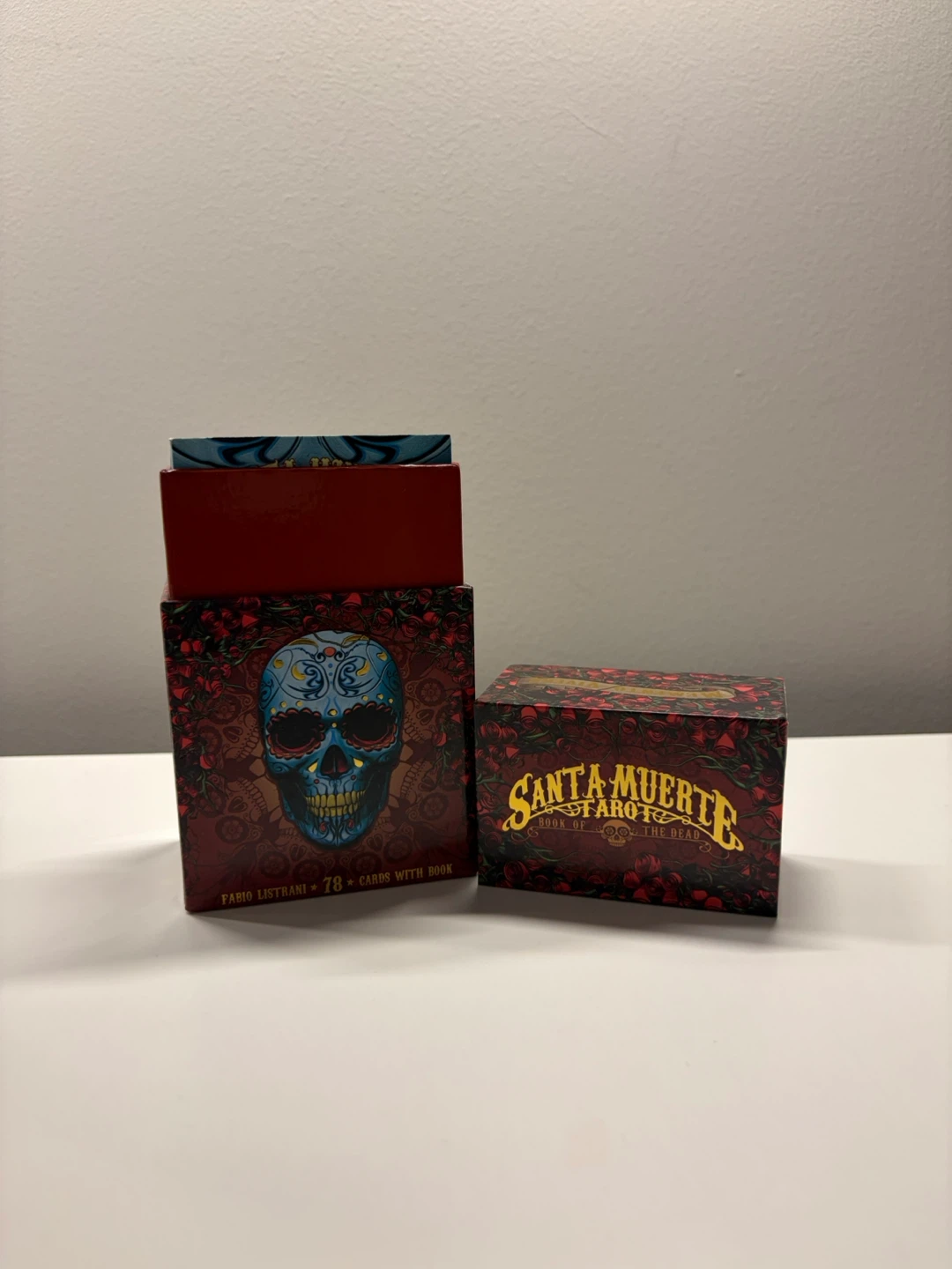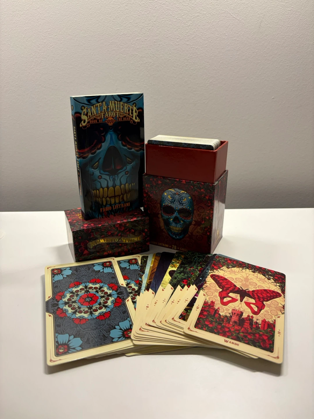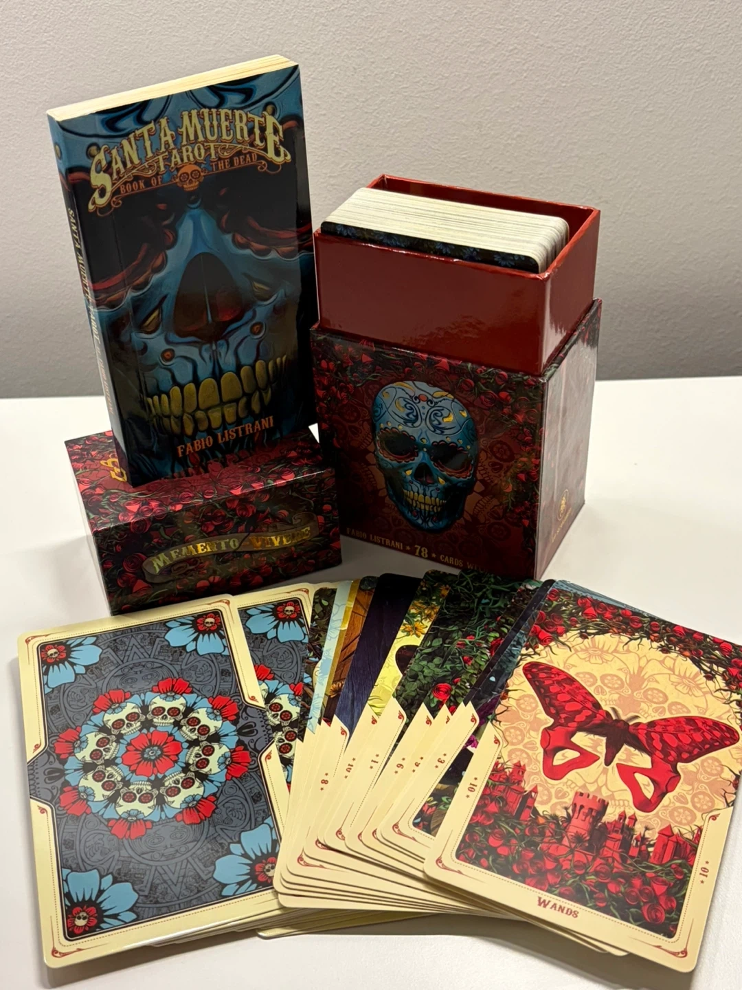 Selling a complete set of Santa Muerte Tarot cards, also known as the Book of the Dead. This set includes 78 cards with a book, all designed by Fabio Listrani. The cards feature beautiful and intricate artwork, perfect for tarot enthusiasts or collectors. The set comes with its original box!